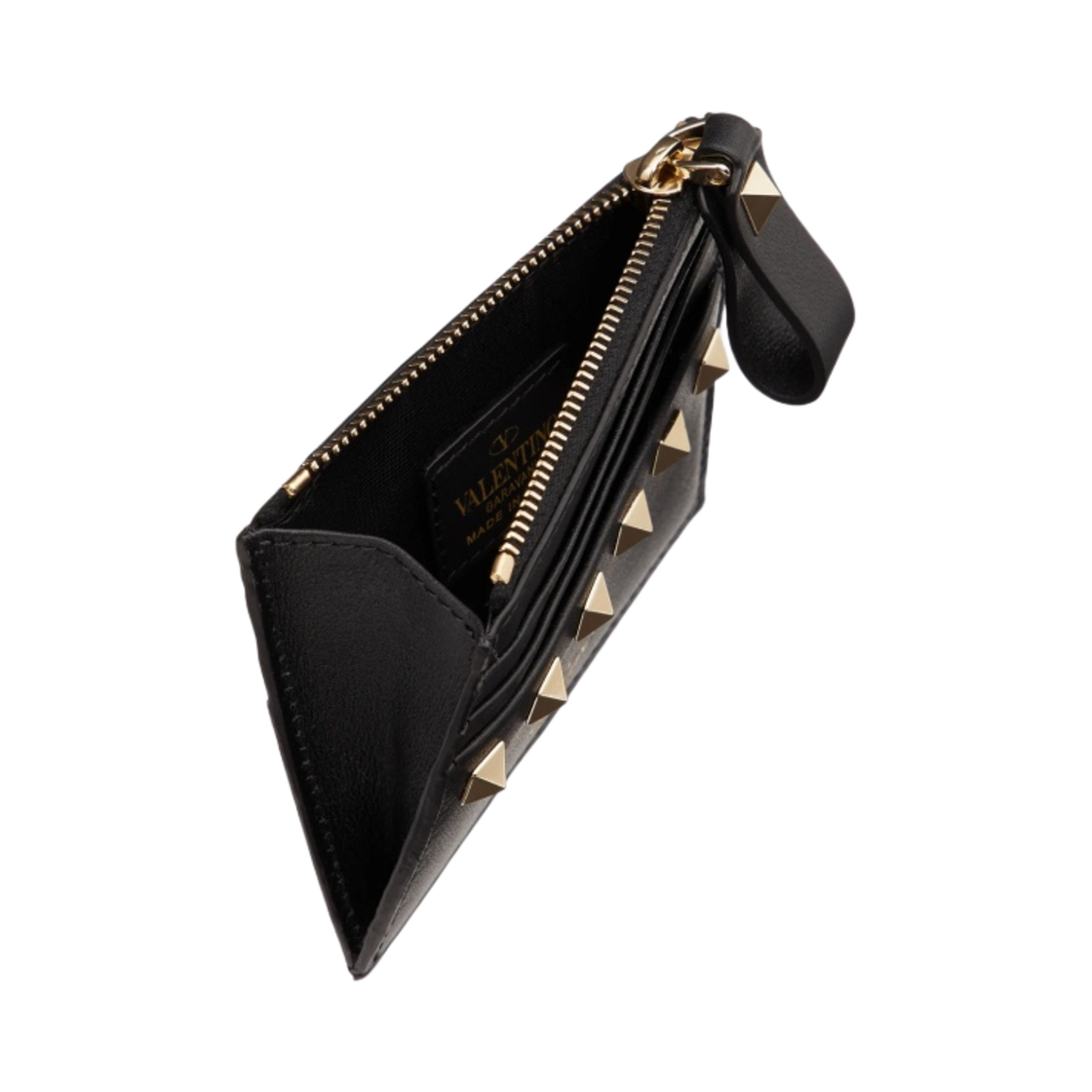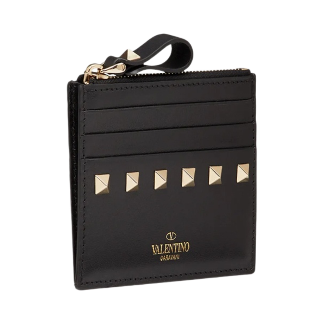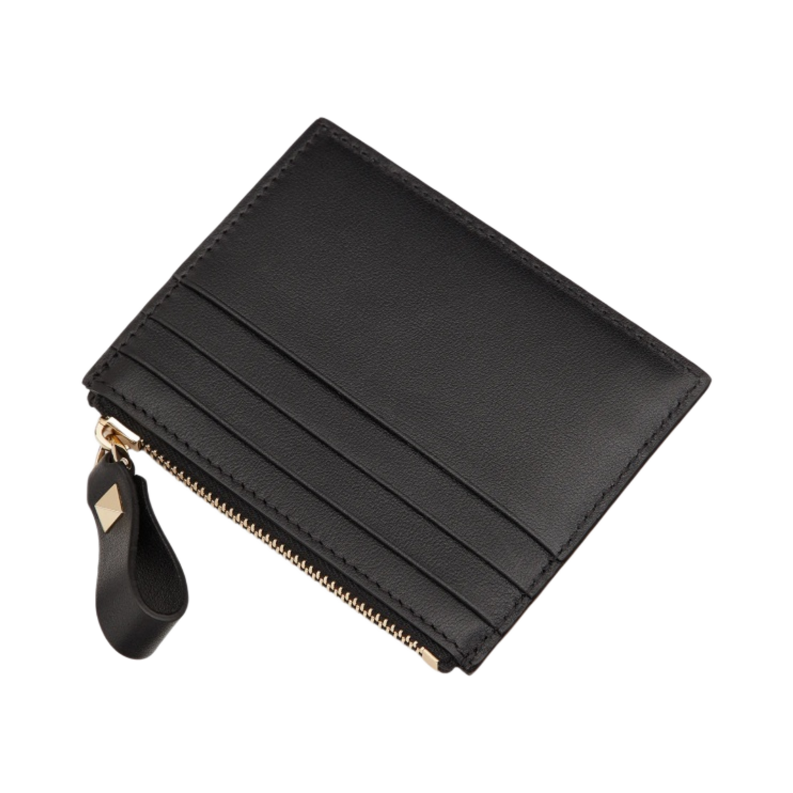 발렌티노 락스터드 카프스킨 지퍼 카드 홀더 블랙