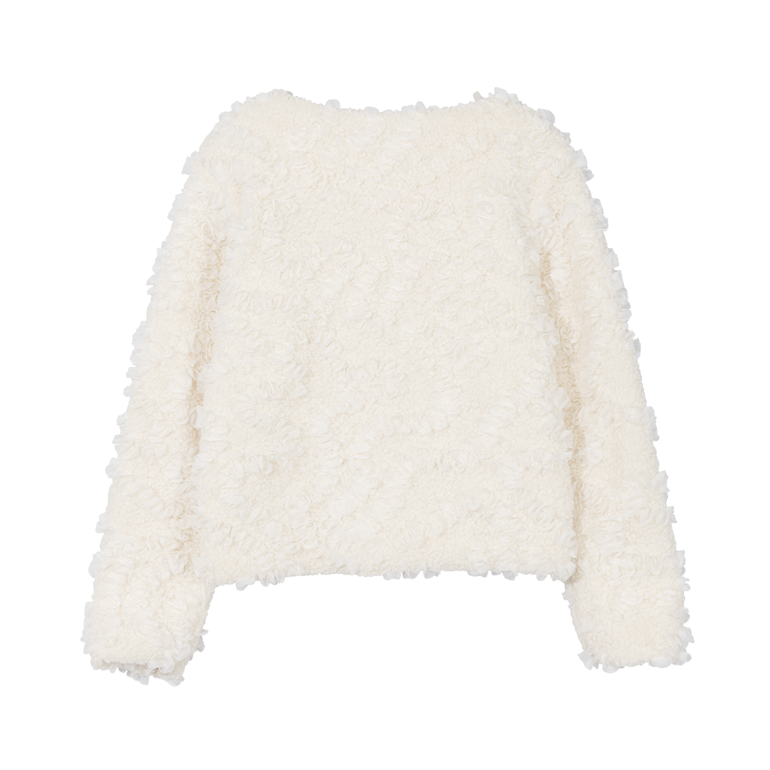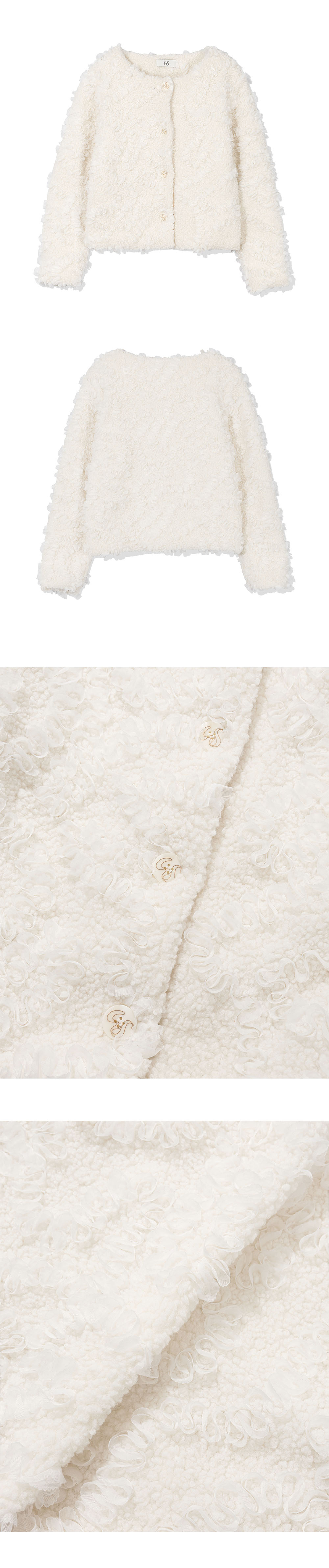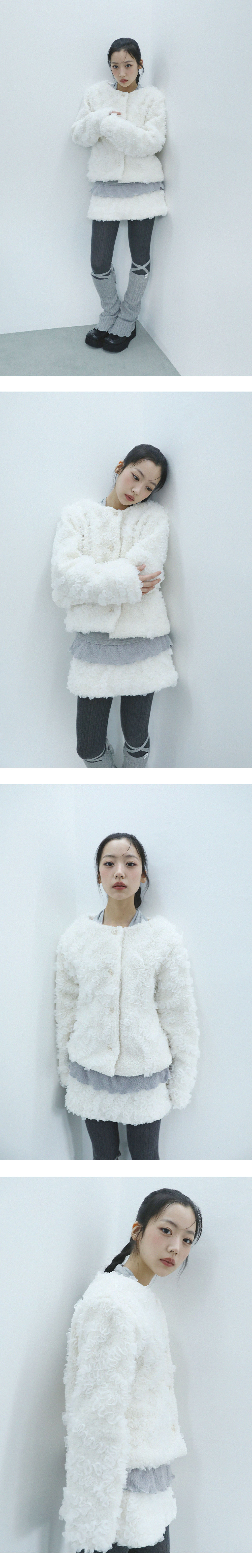 [MADE IN KOREA] [Material] Polyester 100% [Date of Manufacture] 2025.11 [Model] 160cm / Top (S) Bottom (S) ** Model Fitting Size : F [Size Guide] F : Shoulder 47 Chest 49 Sleeve 60 Total Length 58 (cm) * 측정 방식에 따라 1-2 cm 오차가 있을 수 있습니다. * 화면에 따라 실제 색상이 차이가 날 수 있습니다. 양 털 위에 러플 디테일을 더한 독특한 텍스쳐가 포인트인 퍼 자켓입니다. 프론트 단추로 스타일링 무드를 더하였으며, 안감은 후리스 소재로 마감해 보온력까지 뛰어난 실용적인 아우터입니다. * 드라이클리닝 권장 * 손세탁 시 중성세제 사용, 비틀기 금지 * 건조기 사용 금지, 그늘 자연건조 * 비틀기·탈수·건조기 금지 * 러플·양털 부분 문지르지 말 것