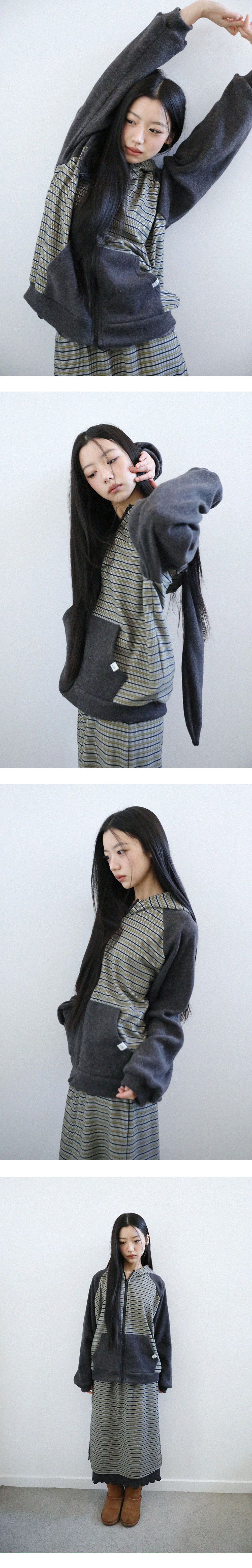 [MADE IN KOREA] [Material] Polyester 90% Spandex 10% [Date of Manufacture] 2025.11 [Model] 160cm / Top (S) Bottom (S) ** Model Fitting Size : F [Size Guide] F : Shoulder 49 Chest 62 Sleeve 59 Total Length 65 (cm) * 측정 방식에 따라 1-2 cm 오차가 있을 수 있습니다. * 화면에 따라 실제 색상이 차이가 날 수 있습니다. 토끼 귀가 달린 후드로 러블리한 포인트를 준 집업입니다. 스트라이프 몸판과 솔리드 소매의 배색 조합이 확실한 스타일 포인트가 되고, 포근한 원단과 넉넉한 핏으로 편하게 착용할 수 있는 아이템입니다. * 드라이클리닝 권장 * 손세탁 시 중성세제 사용, 비틀기 금지 * 건조기 사용 금지, 그늘 자연건조 * 비틀기·탈수·건조기 금지