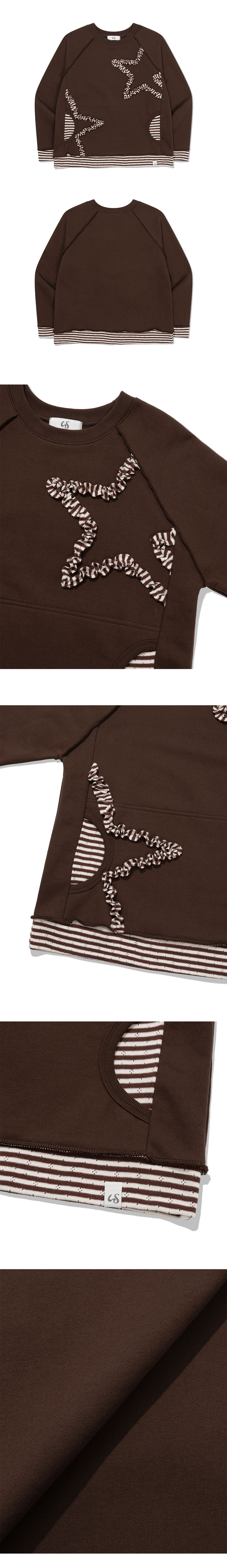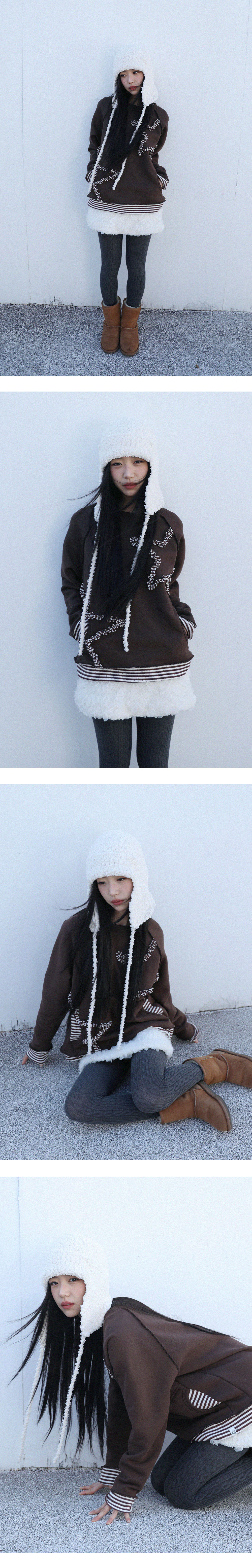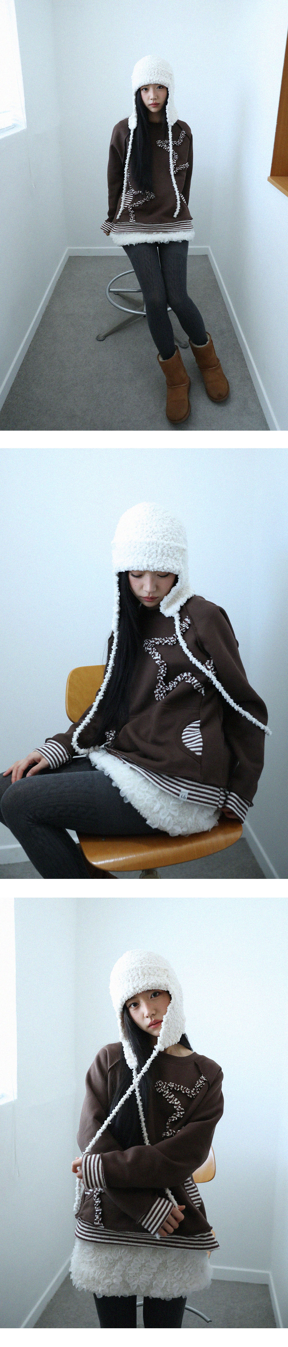 [MADE IN KOREA] [Material] Cotton 100% [Date of Manufacture] 2025.11 [Model] 160cm / Top (S) Bottom (S) ** Model Fitting Size : F [Size Guide] F : Shoulder 49 Chest 54 Sleeve 65 Total Length 60 (cm) * 측정 방식에 따라 1-2 cm 오차가 있을 수 있습니다. * 화면에 따라 실제 색상이 차이가 날 수 있습니다. 스타 포인트의 스웻 셔츠입니다. 둥근 모양의 주머니 디테일로 귀엽고 캐주얼하게 착용 가능합니다. 밑단 스트라이프 배색 디테일이 더 해졌습니다. 부드러운 면 소재로 세탁기 사용 시 약간의 수축이 있을 수 있으니, 손세탁을 권장 드립니다. * 드라이클리닝 권장 * 손세탁 시 중성세제 사용, 비틀기 금지 * 건조기 사용 금지, 그늘 자연건조 * 비틀기·탈수·건조기 금지