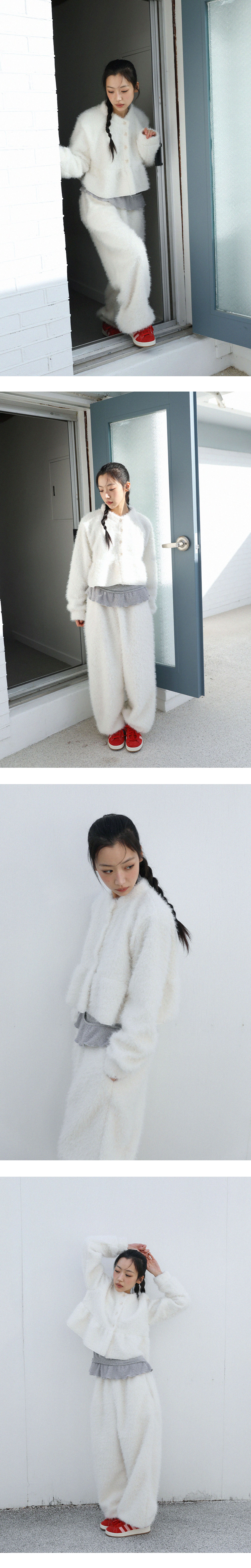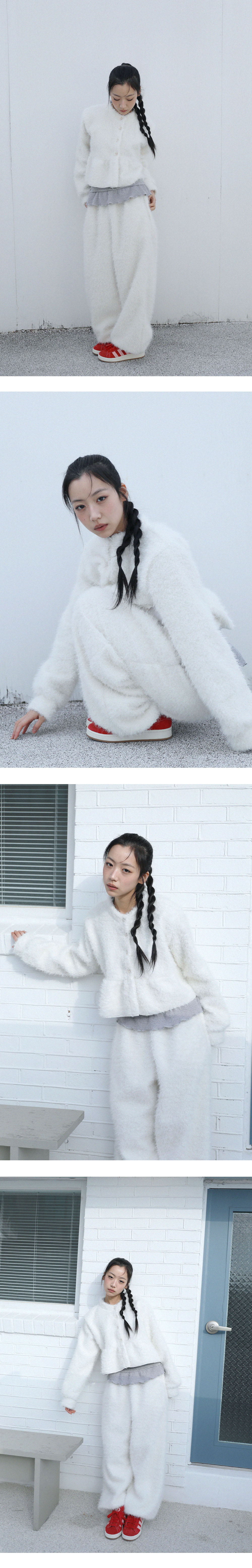 [MADE IN KOREA] [Material] Polyester 100% [Date of Manufacture] 2025.11 [Model] 160cm / Top (S) Bottom (S) ** Model Fitting Size : F [Size Guide] F : Waist 35 Hip 50 Rise 40 Thigh 33 Total Length 105 (cm) * 측정 방식에 따라 1-2 cm 오차가 있을 수 있습니다. * 화면에 따라 실제 색상이 차이가 날 수 있습니다. 겉감은 부클레 원단을 사용하여 포슬포슬한 텍스처이며, 안감은 부드러운 기모 원단을 사용하여 한층 더 따뜻하게 착용하실 수 있는 팬츠입니다. * 드라이클리닝 권장 * 손세탁 시 중성세제 사용, 비틀기 금지 * 건조기 사용 금지, 그늘 자연건조 * 비틀기·탈수·건조기 금지