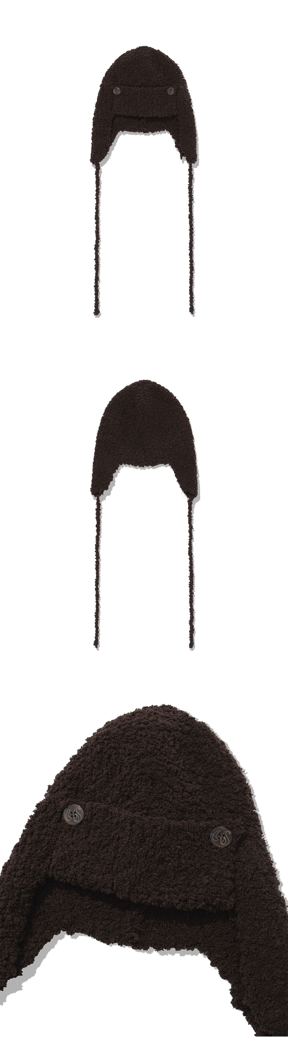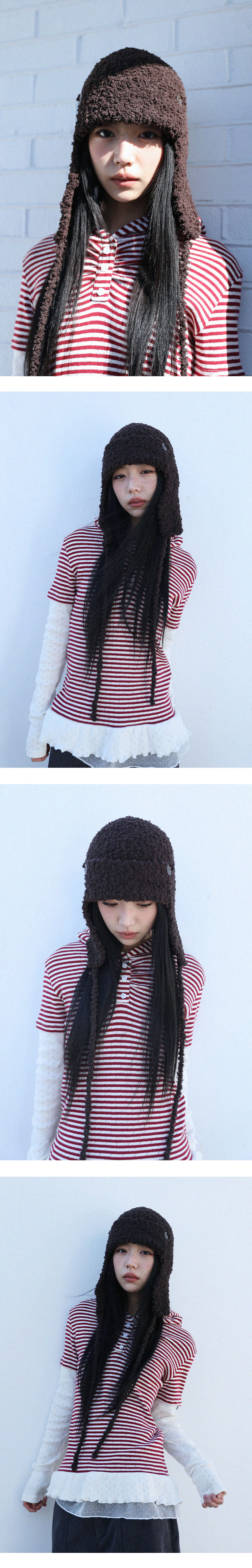 [MADE IN KOREA] [Material] Polyester 100% [Date of Manufacture] 2025.11 [Model] 160cm / Top (S) Bottom (S) ** Model Fitting Size : F [Size Guide] F : Head cross-section 29 Depth 23 (cm) * 측정 방식에 따라 1-2 cm 오차가 있을 수 있습니다. * 화면에 따라 실제 색상이 차이가 날 수 있습니다. 부클레 소재로 포근하게 제작 된 트루퍼 햇입니다. 프론트 부분 단추로 포인트 되었습니다. * 드라이클리닝 권장 * 손세탁 시 울세제 사용, 비틀기 금지 * 건조기 사용 금지, 그늘 자연건조 * 비틀기·탈수·건조기 금지