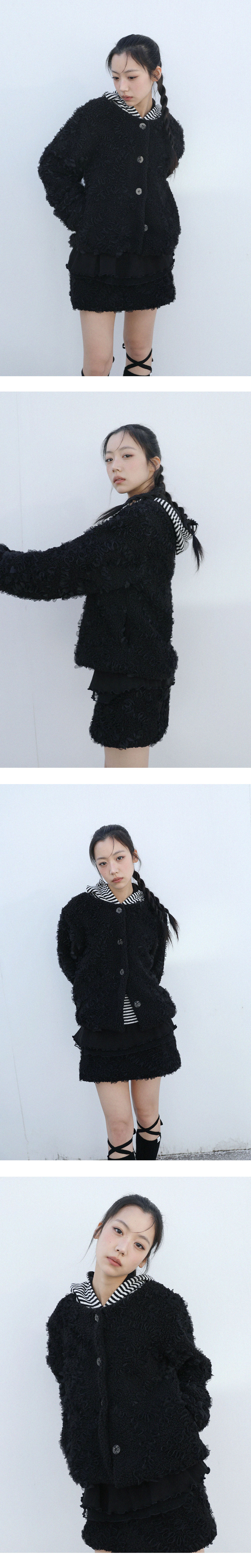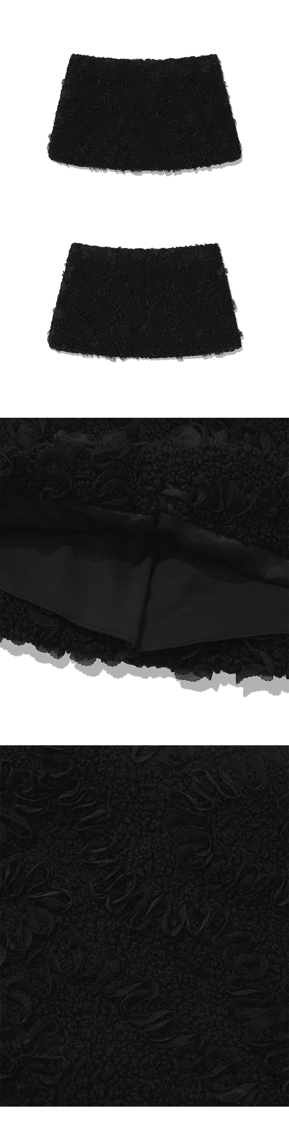 [MADE IN KOREA] [Material] Polyester 100% [Date of Manufacture] 2025.11 [Model] 160cm / Top (S) Bottom (S) ** Model Fitting Size : S [Size Guide] S : Waist 38 Hip 48 Hem 52 Total Length 28 (cm) M : Waist 40 Hip 50 Hem 54 Total Length 29 (cm) * 측정 방식에 따라 1-2 cm 오차가 있을 수 있습니다. * 화면에 따라 실제 색상이 차이가 날 수 있습니다. 양 털 위에 러플 디테일을 더한 독특한 텍스쳐가 포인트인 퍼 미니 스커트 입니다. * 드라이클리닝 권장 * 손세탁 시 울세제 사용, 비틀기 금지 * 건조기 사용 금지, 그늘 자연건조 * 비틀기·탈수·건조기 금지