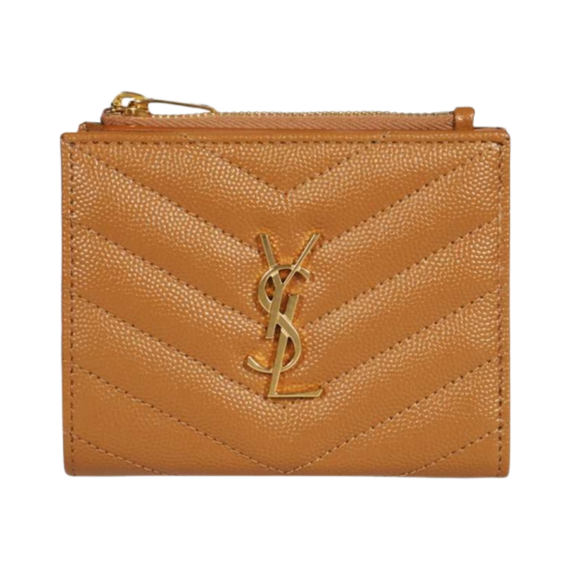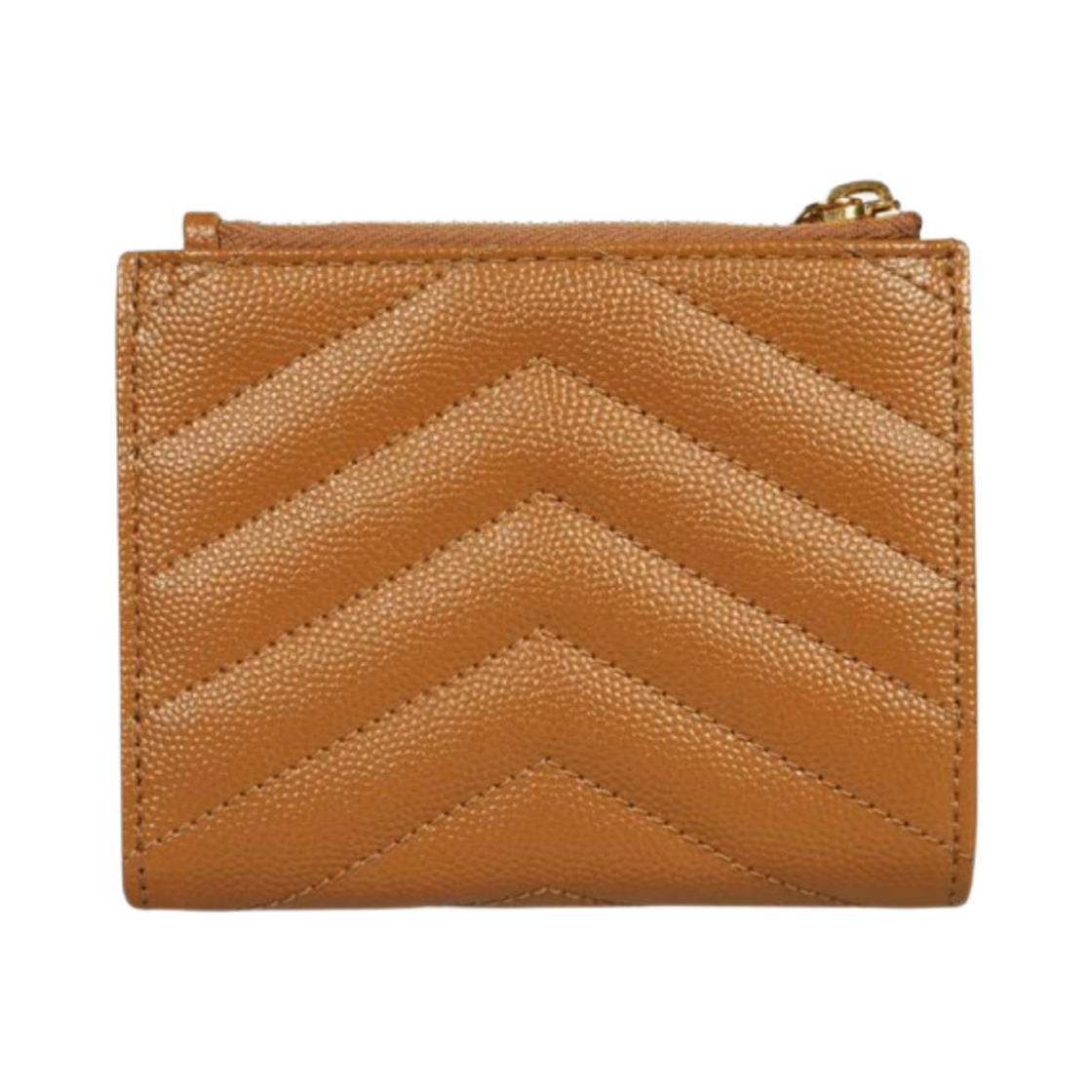 Saint Laurent Cassandre Matelasse Bi-fold Wallet in Grain de Poudre Embossed Leather Dark Natural