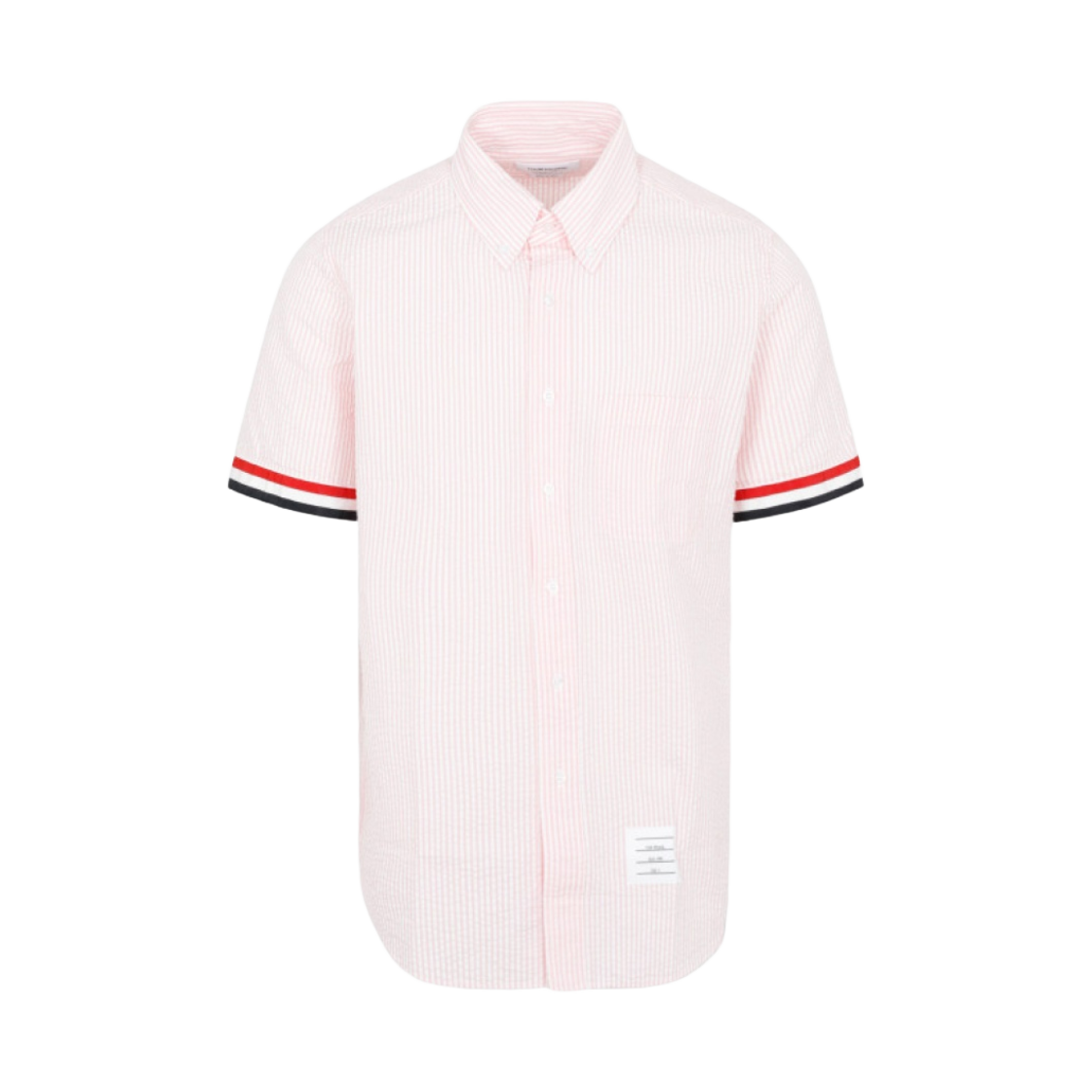 Thom Browne Cotton Seersucker Grosgrain Cuff Straight Fit Short Sleeve Shirt Light Pink