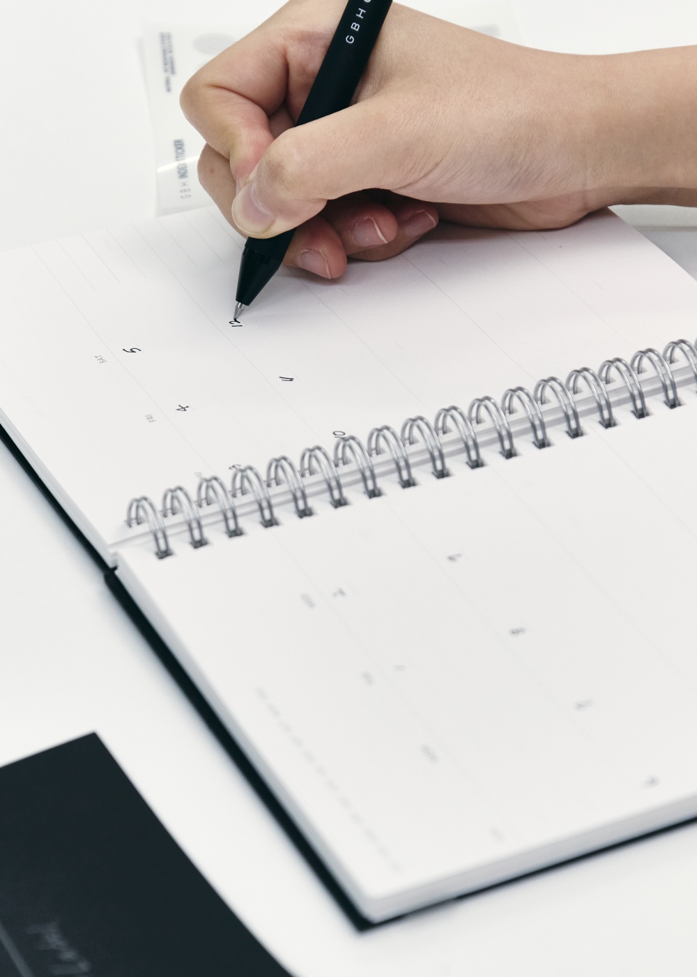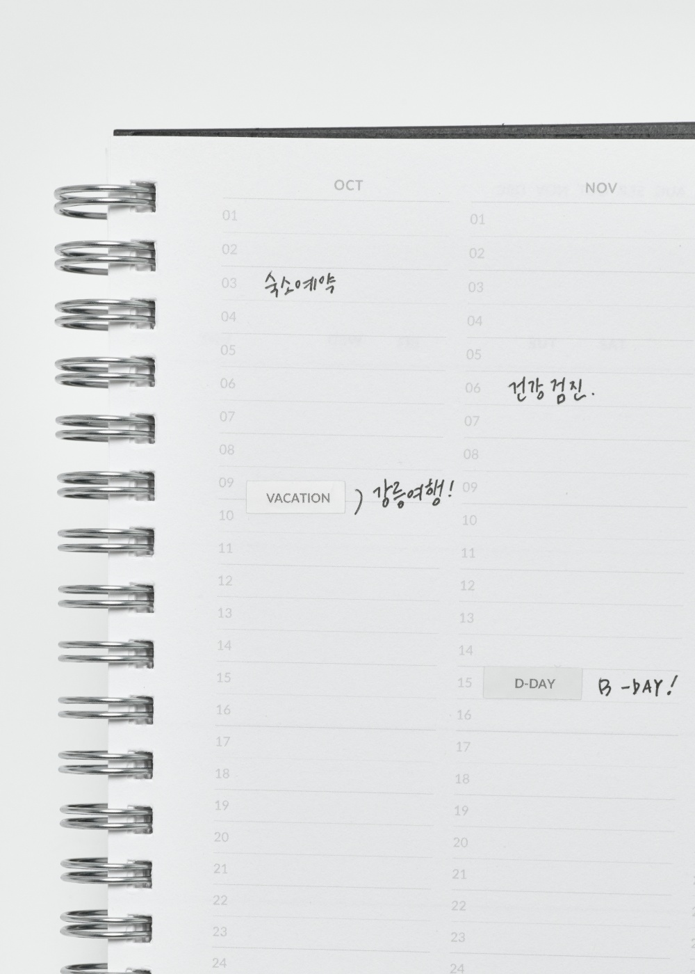 다이어리 내부 뒷면 종이포켓에 스티커, 명함, 문서 등을 함께 보관 가능합니다. 실버 트윈링으로 페이지를 넘기는 데에 편리하며, 튼튼하게 제작되었습니다. 코팅 없이 종이 본연의 자연스러운 질감을 느낄 수 있습니다. 날짜 기입형의 만년 다이어리로 년도에 구애받지 않고 사용할 수 있습니다. 주의 사항 배송 과정상 스크레치 및 구겨짐 방지하고자 최대한 노력하고있습니다. 다만, 생산 및 유통과정에서 경미한 스크래치 및 구겨짐 등이 있을 수 있습니다. 인쇄 공정 상 모든 페이지를 최대한 똑같이 프린팅하여 제본하고 있으나, 상하좌우로 1-2mm정도의 미세한 차이가 생길 수 있습니다. 사이즈 W145 X H175 X D15 mm, 0.27kg 기준에 따라 최대 1~2cm 정도의 사이즈 편차가 있을 수 있습니다. 가로 폭(W145)은 스프링 포함 기준입니다. 소재 PAPER 100%, PET STICKER, ABS,PC 원산지KOREA