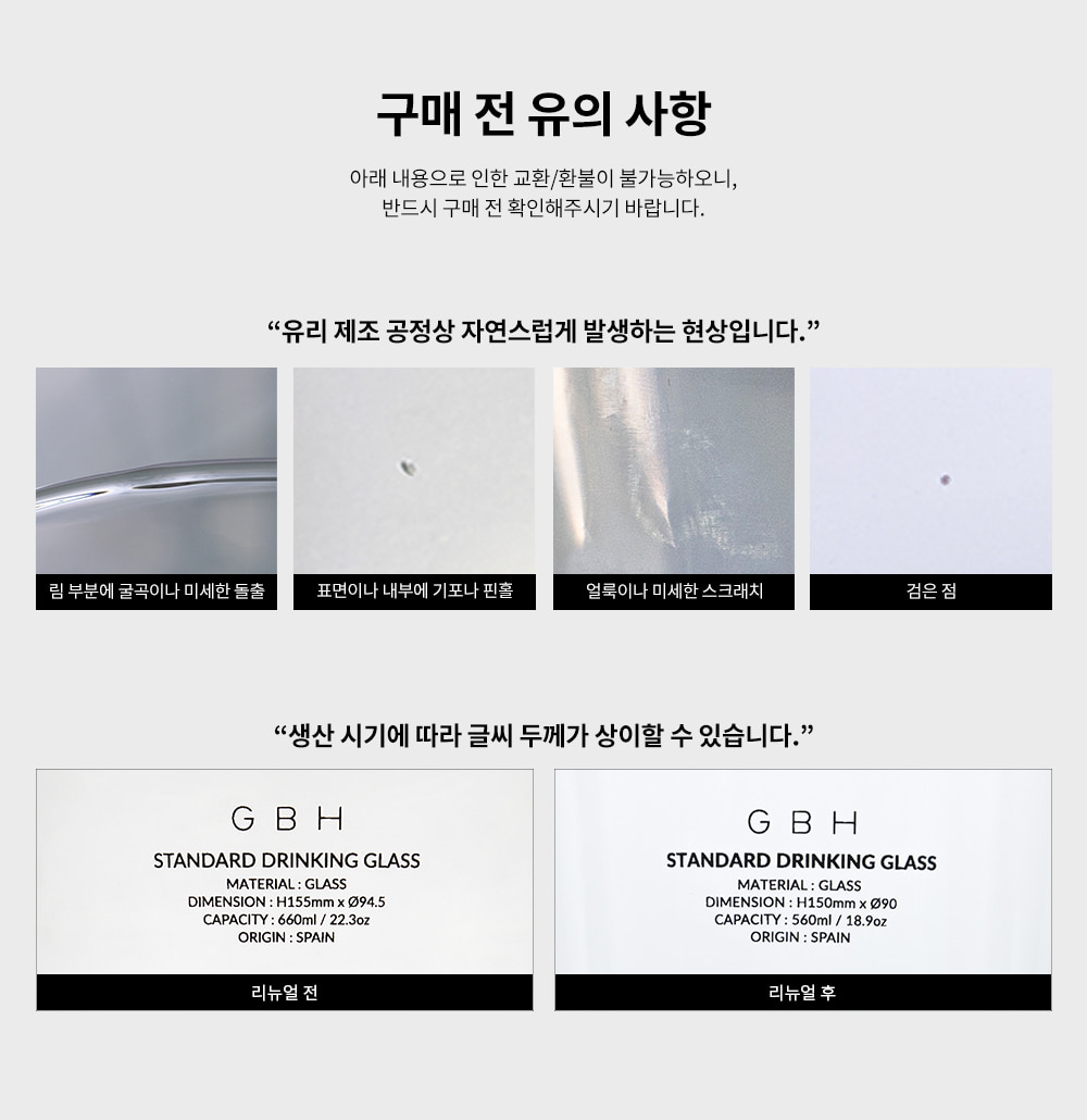 주의 사항 - 일반 유리컵에 비해 5배 강한 강도로 전자레인지 사용이 가능합니다. - 식기 세척기 사용이 가능하지만, 같은 부분에 여러번 마찰과 세척을 반복하는 세척 특성상 레터링이 지워지거나 연해질 수 있습니다. - 약 135도의 열차이를 견뎌내는 내구성이 있지만, 급냉했던 컵을 기준 이상으로 뜨겁게 하는 등의 급격한 온도변화는 파손의 원인이 될 수 있으니 과도하고 급격한 온도변화는 삼가주세요. - 새 컵이 약간 뿌옇게 보이는 현상은 먼지가 아니라 최종 공장 소독 과정을 거치고 나오며 생기는 자연스러운 현상이므로 세척시 깨끗해 집니다. 사이즈S : 220ml / 7.4oz / H10.5cm x Φ7.1 소재GLASS 100% 원산지SPAIN