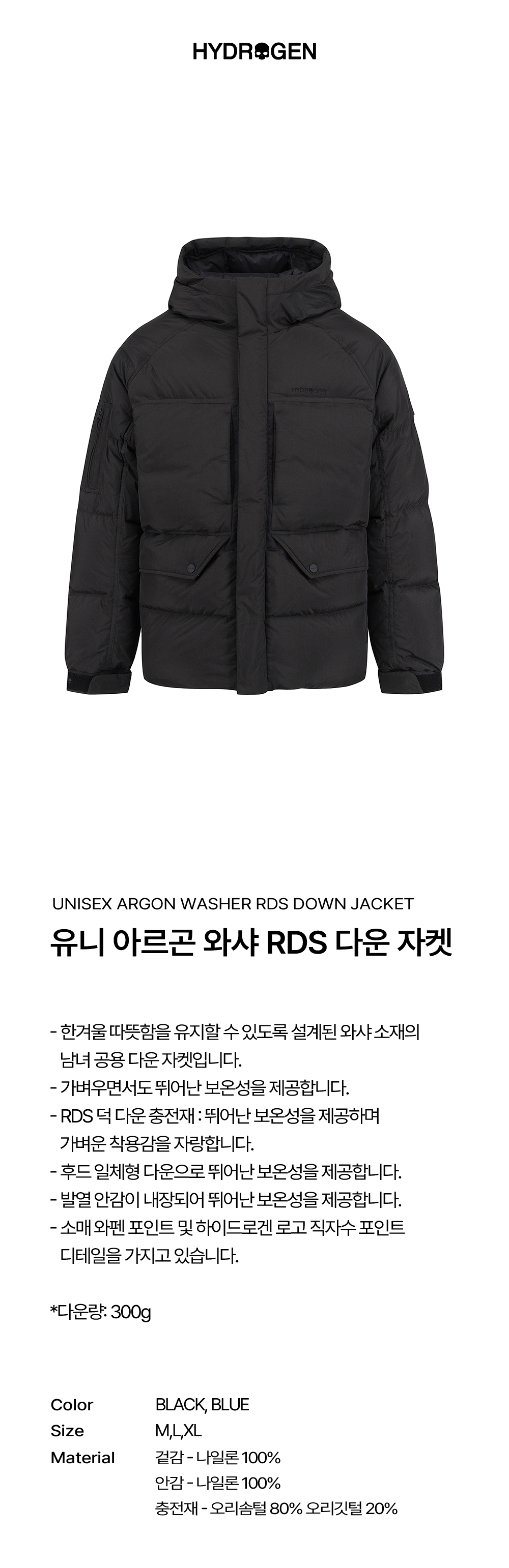 하이드로겐 유니 아르곤 와샤 RDS 다운 자켓 블랙