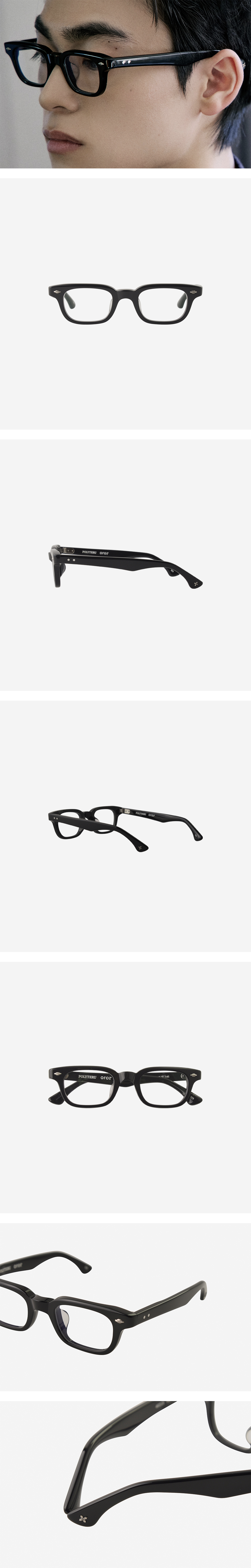 OROR x Polyteru P.O - 001 Acetate Black 80-90년대 빈티지 피스에서 영감을 받아 디자인한 모델로, 클래식한 쉐입에 볼륨을 더하거나 사이즈 발란스를 살짝 뒤틀어 위트 있는 쉐입으로 제작하였습니다. 여기에 폴리테루의 시그니처 실버 주얼리 장식을 프론트와 템플 끝에 장식하여 유니크하고 고급스러운 느낌을 살렸습니다. 뿔테는 광택감이 높은 아세테이트 소재가 사용되었으며, 메탈 프레임은 내구성이 좋은 베타 티타늄이 사용되었습니다. 두 모델에는 플랫한 커브의 렌즈가 세팅되어져 있으며, 자외선 차단 기능이 있고 투과율이 높은 광학용 렌즈입니다. *매장에서는 피팅 조정이 어려우므로, 구매 후 가까운 안경점에서 피팅을 받으시면 더욱 편안하게 착용하실 수 있습니다. *오르오르 매장 방문 시에는 별도 비용 없이 무료로 피팅 조정이 가능하오니 참고 부탁드립니다. *한남스토어, 더현대 서울점 방문 시, 틴트 렌즈가 적용된 샘플도 준비되어 있으니 참고 부탁드립니다.