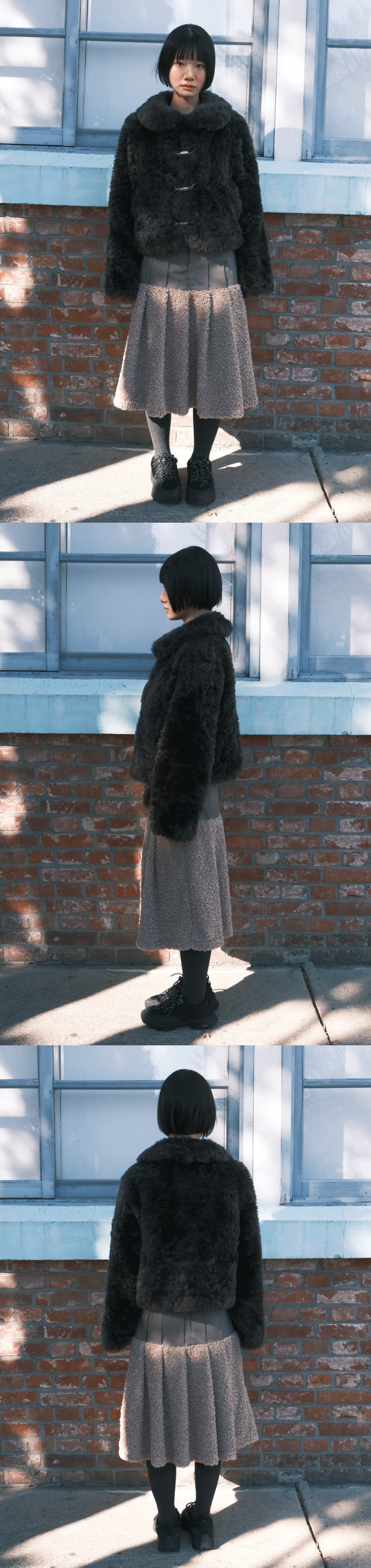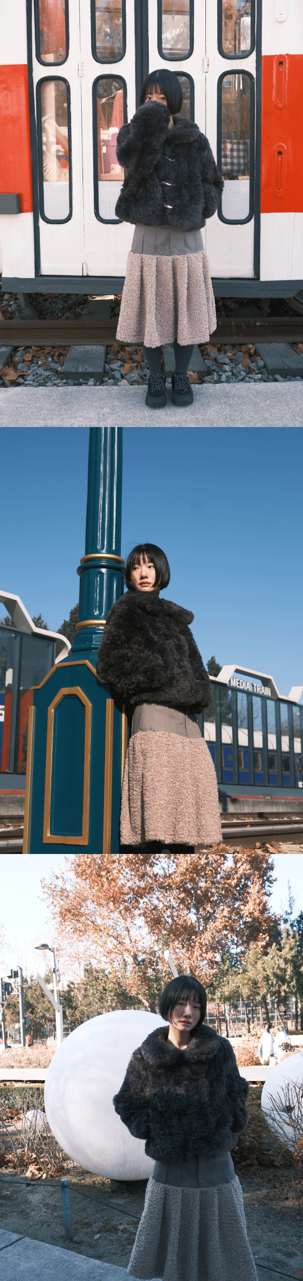 PRODUCT INFO - 플레어 핏의 미디움 기장 스커트 - 플리스 원단 배색 - YKK 지퍼 사용 - 허리 부분 밴딩 BODY1 COTTON 97 POLYURETHANE 3 / BODY2 POLYESTER 100 드라이클리닝 권장 (건조기 사용 금지) SIZE GUIDE ONE SIZE 총장 60 허리 34.5~40 힙 47 밑단 86 MODEL 160CM, 44SIZE