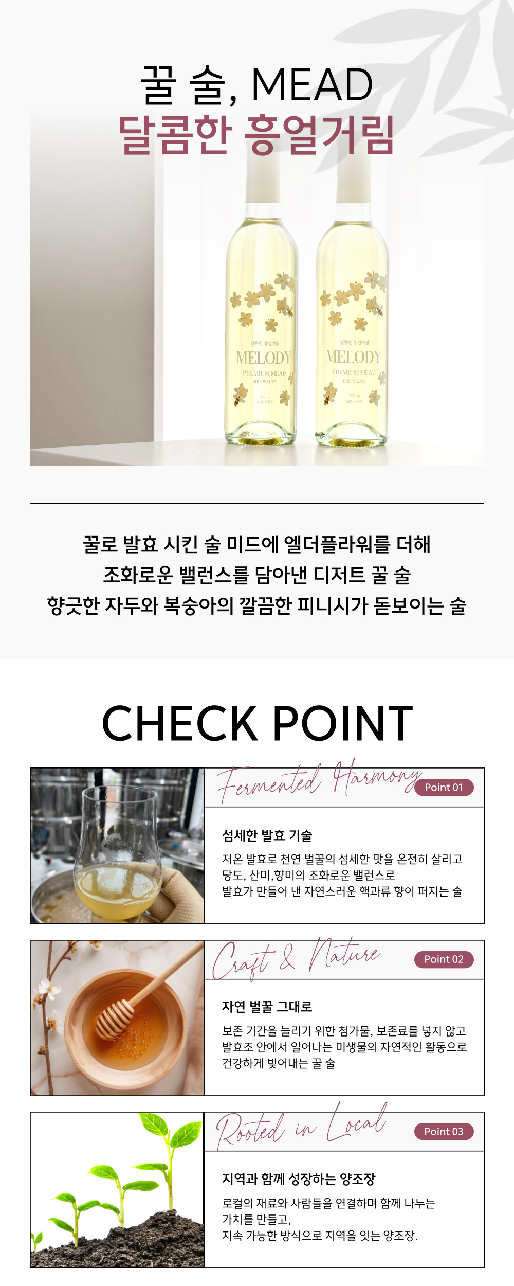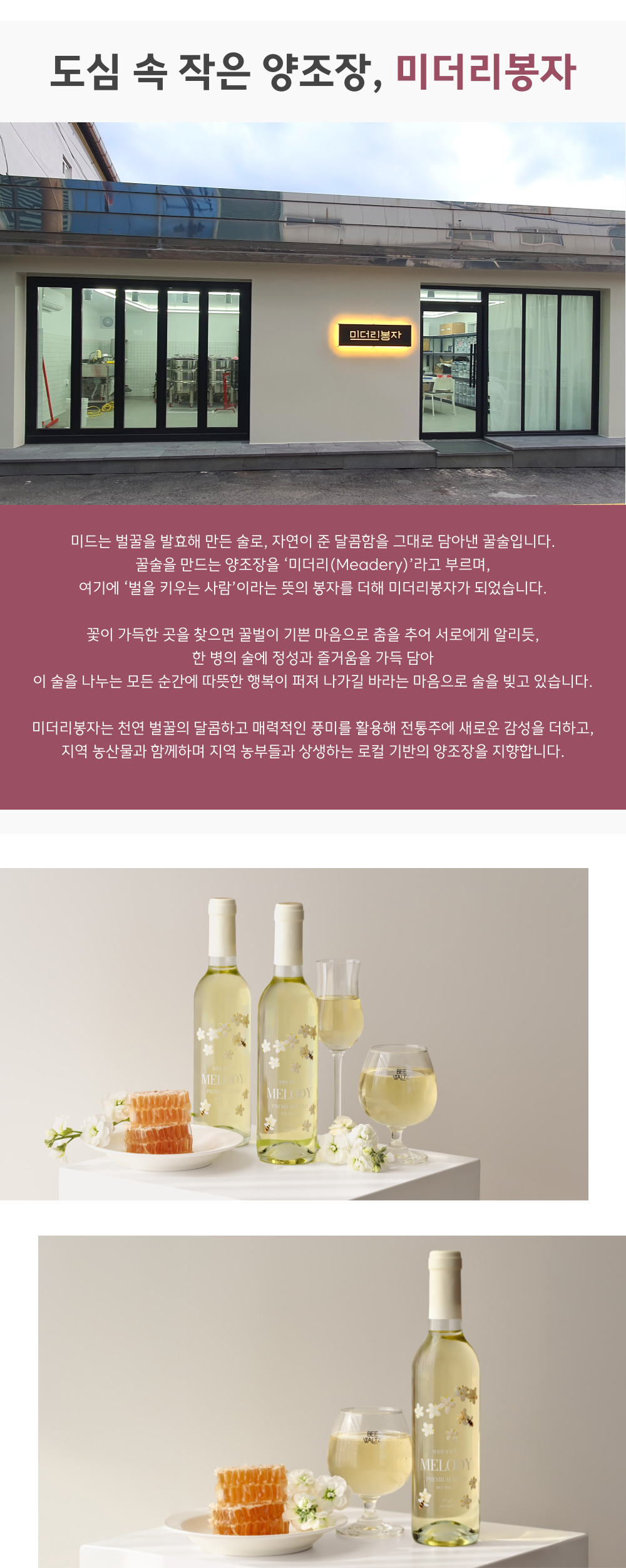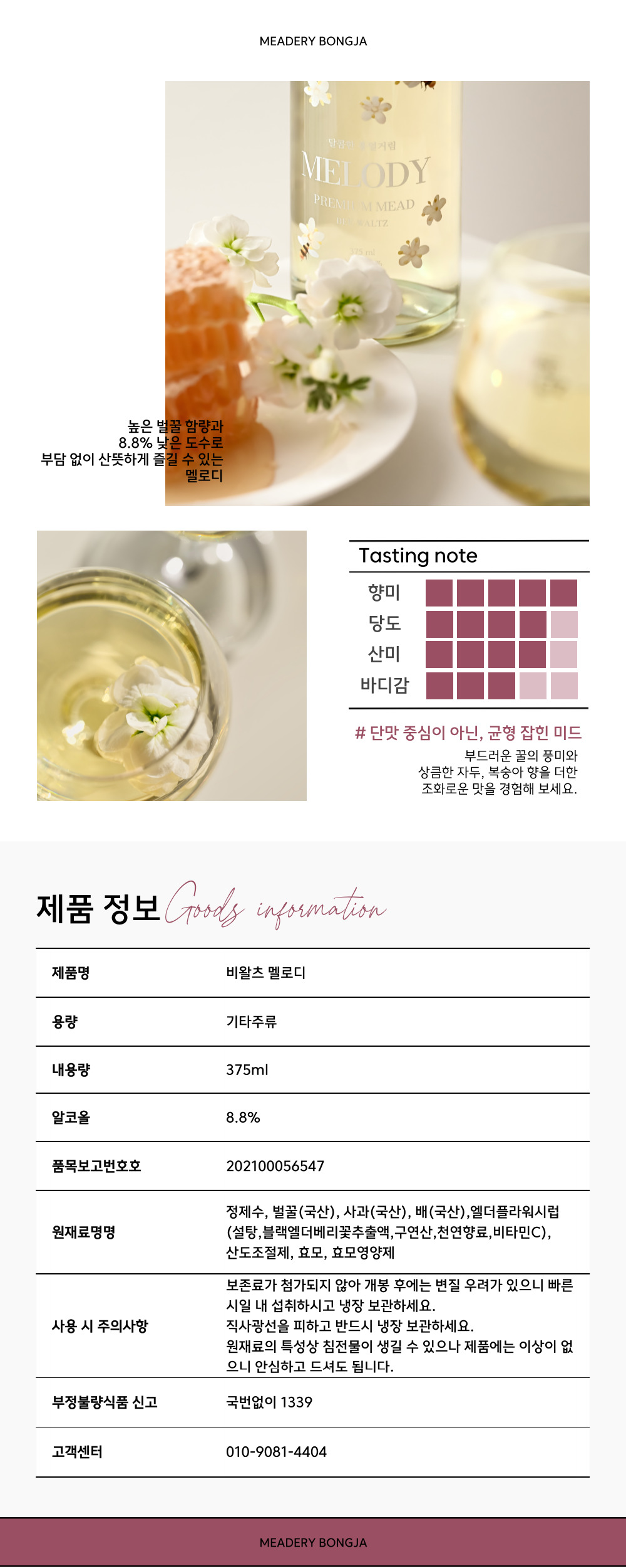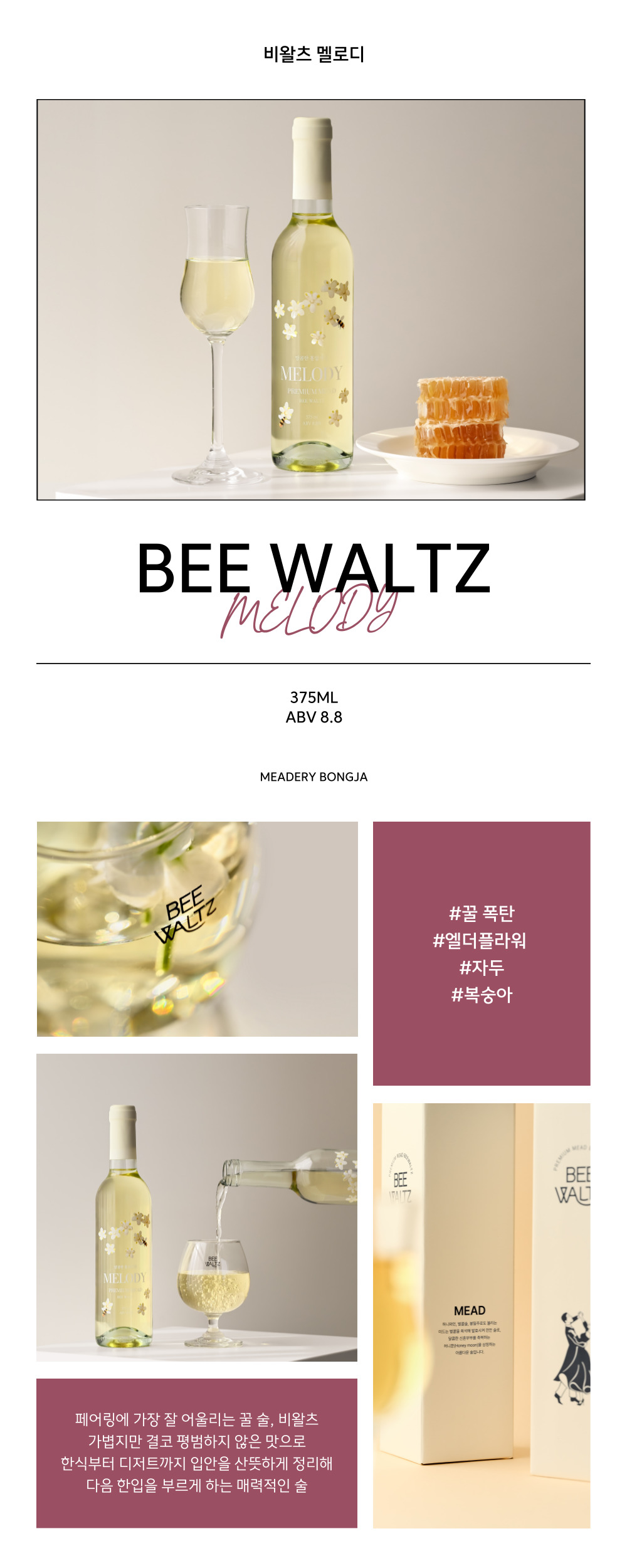 비왈츠 멜로디는 천연 벌꿀을 발효해 만든 미드로, 가볍고 산뜻하지만 결코 평범하지 않은 풍미를 지닌 꿀술로 부드러운 단맛과 은은한 과일·꽃 향이 조화롭게 어우러진 술입니다. 자극 없이 편안하게 즐길 수 있어, 일상의 여유로운 순간에 잘 어울립니다.
