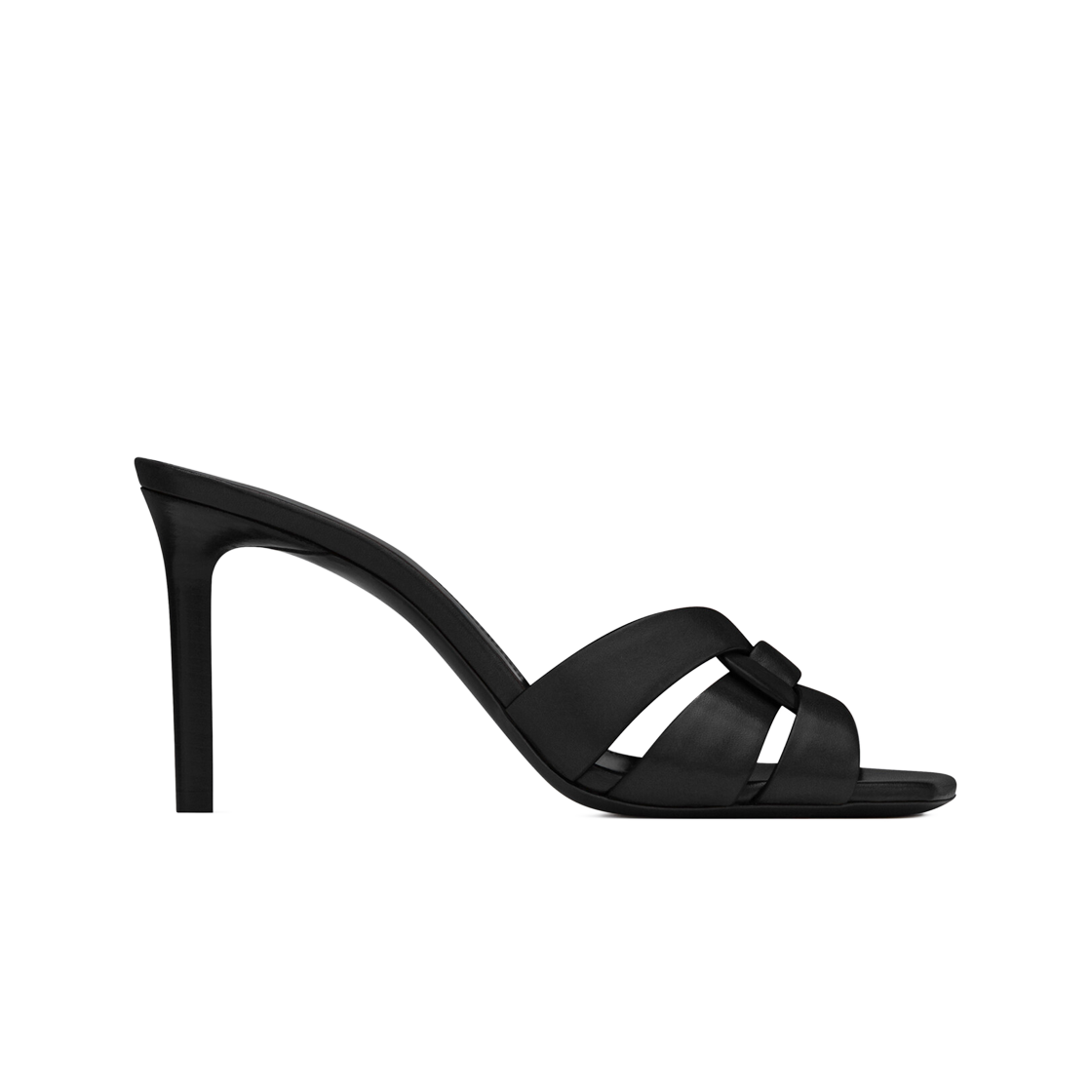 (W) Saint Laurent Tribute Heeled Mules in Smooth Leather Black