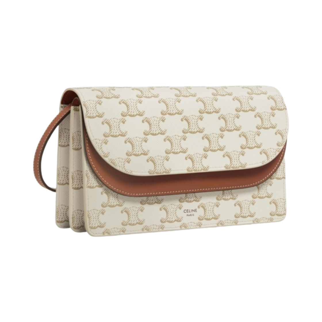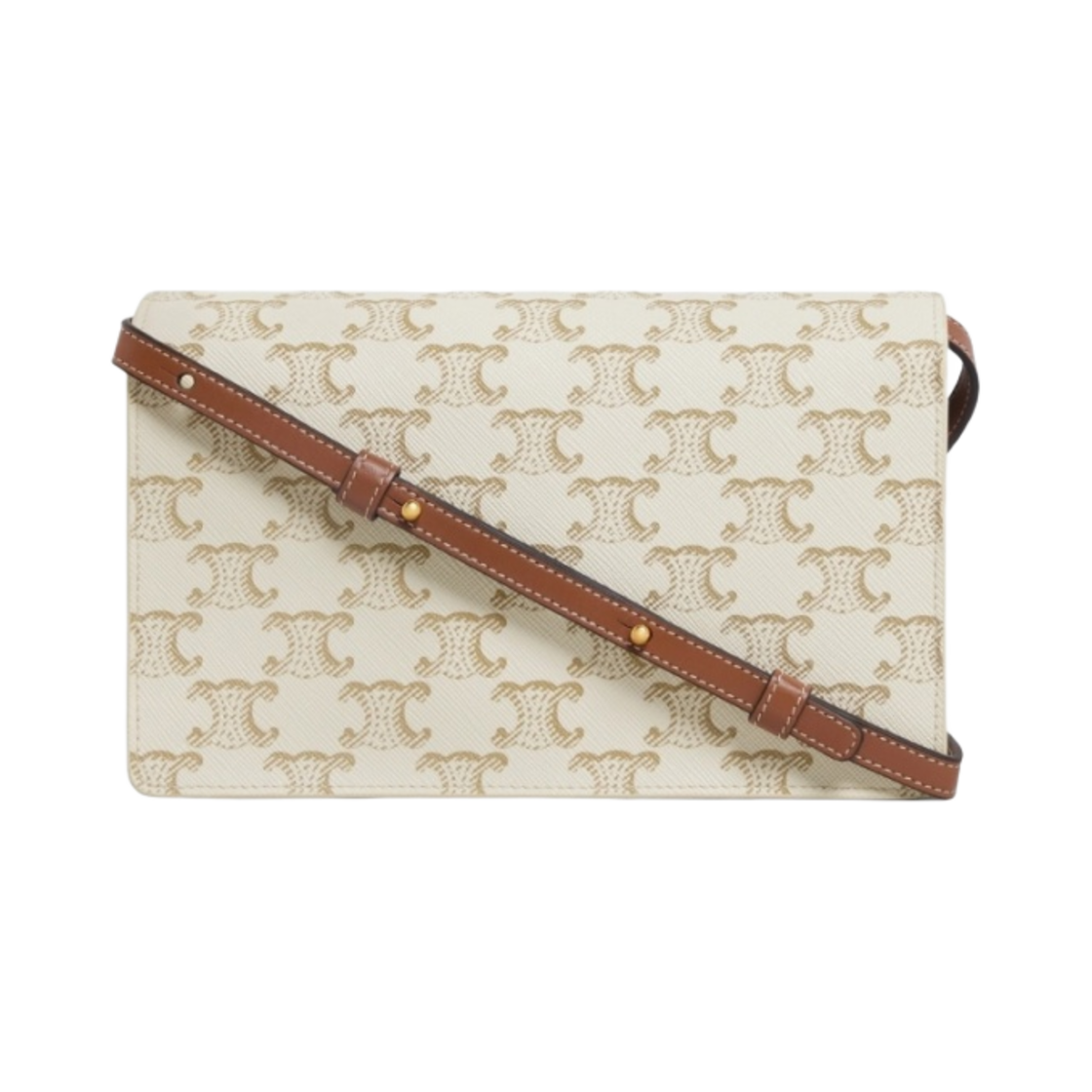 Celine Wallet on Strap in Triomphe Canvas and Smooth Lambskin White Tan