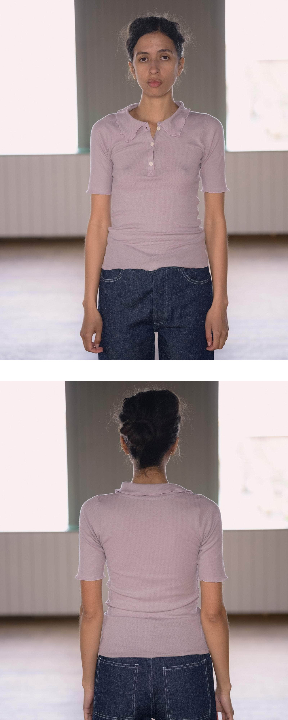 베이스레인지 우먼 듀얼 폴로 베르베 퍼플입니다. - 골지 폴로 셔츠 - 반단추 여밈 * 모델 스펙: 166cm, S 사이즈 착용