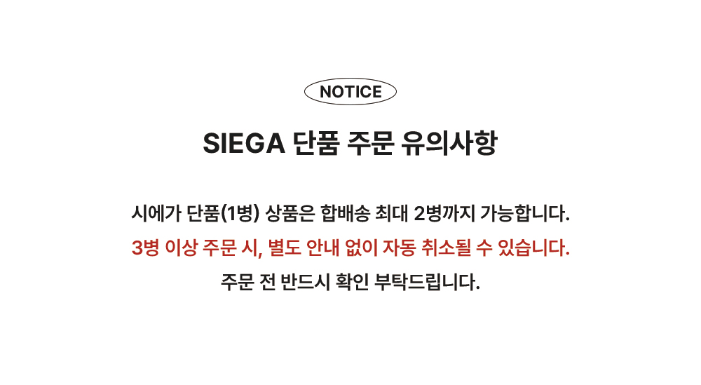 시에가 단품(1병) 상품은 합배송 최대 2병까지 가능합니다. 3병 이상 주문 시, 별도 안내 없이 자동 취소될 수 있습니다. 주문 전 반드시 확인 부탁드립니다.