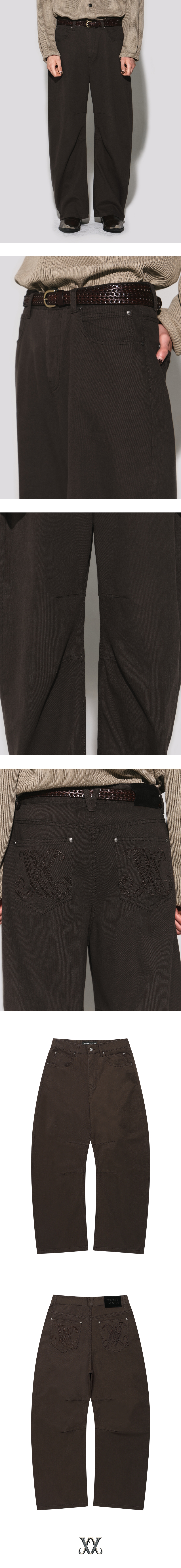 - 커브드 아웃심 디자인의 와이드 핏 데님팬츠 - 무릎 두 개의 다트 디테일로 커브드 실루엣 강조 - 뒤포켓 고급스러운 로고 자수 스티치 포인트 - 뒤 중심 허릿단 V 모양 벨트고리 디테일 - 흑니켈 로고 각인 금속 캔톤, 리벳 사용 - 웨슬리 휴스턴 로고 스웨이드 텍션지 마감 - DRY CLEAN or WASH SEPARATELY