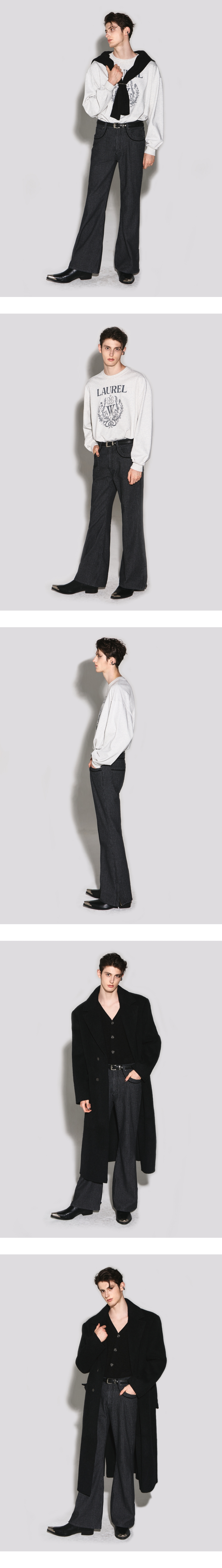 - 부츠컷 실루엣과 블랙 스트라이프 데님 팬츠 - 앞 & 뒤 포켓, 뒷 요크의 절개 디테일 - 웨스턴 문양의 블랙 벨벳 테이프 포인트 - 허벅지, 오금, 밑단 엠보 캣 워싱 작업 - 밑단 YKK 지퍼로 다양한 부츠컷 실루엣 연출 - 흑니켈 금속 캔톤과 리벳, 기모 주머니감 사용 - 웨슬리 휴스턴 로고 각인 스웨이드 텍션지 마감 - DRY CLEAN or WASH SEPARATELY