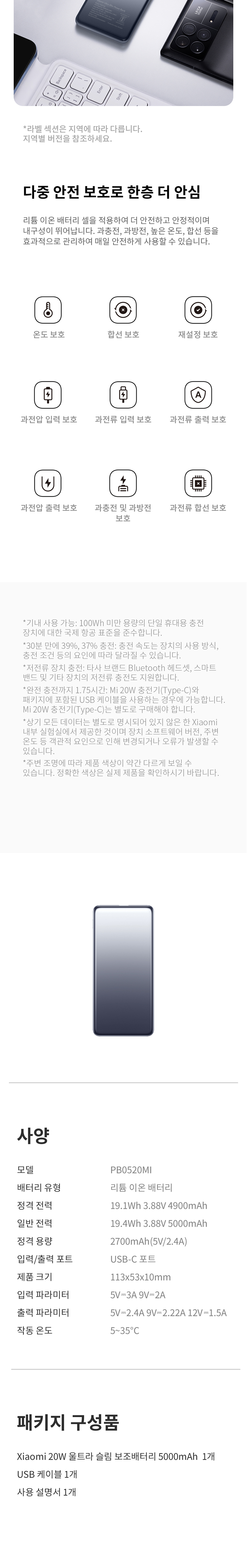 샤오미 보조배터리 5000mAh 초슬림 고속 충전 기내반입 가벼운 미니 C타입 휴대용