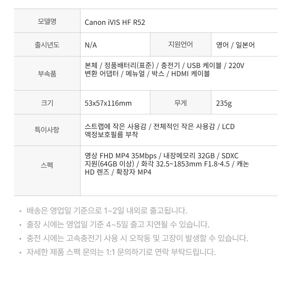 캐논 캠코더 아이비스 HF R52 화이트