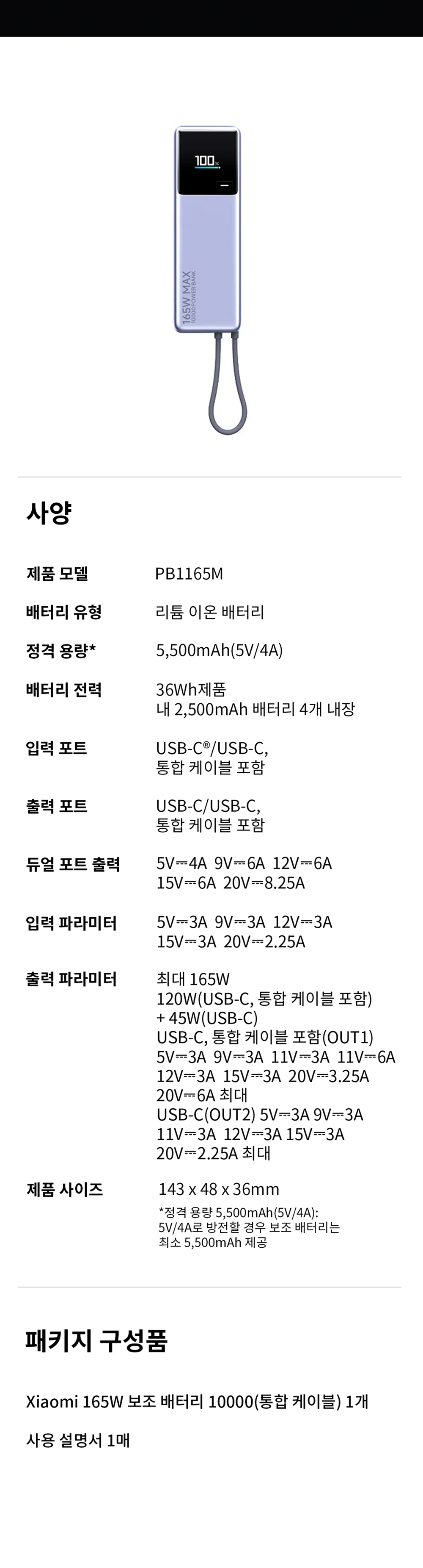 샤오미 보조배터리 10000mAh 165W 초고속 충전 기내반입 기내용 고속 보조밧데리