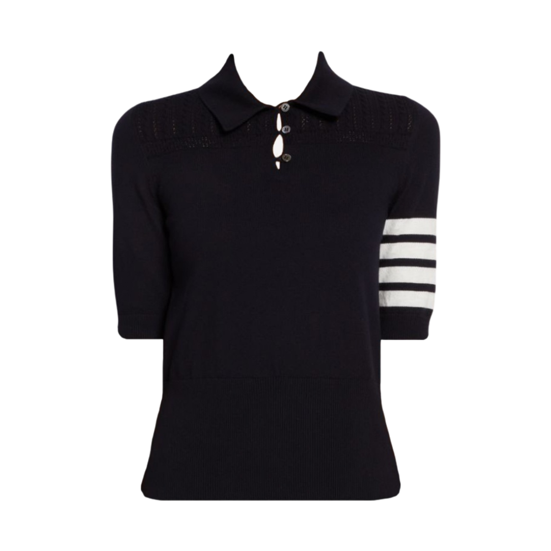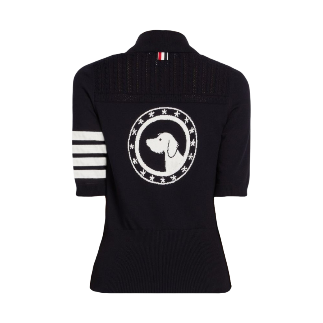 (W) Thom Browne Cotton Hector Medallion 4-Bar Keyhole Polo Navy