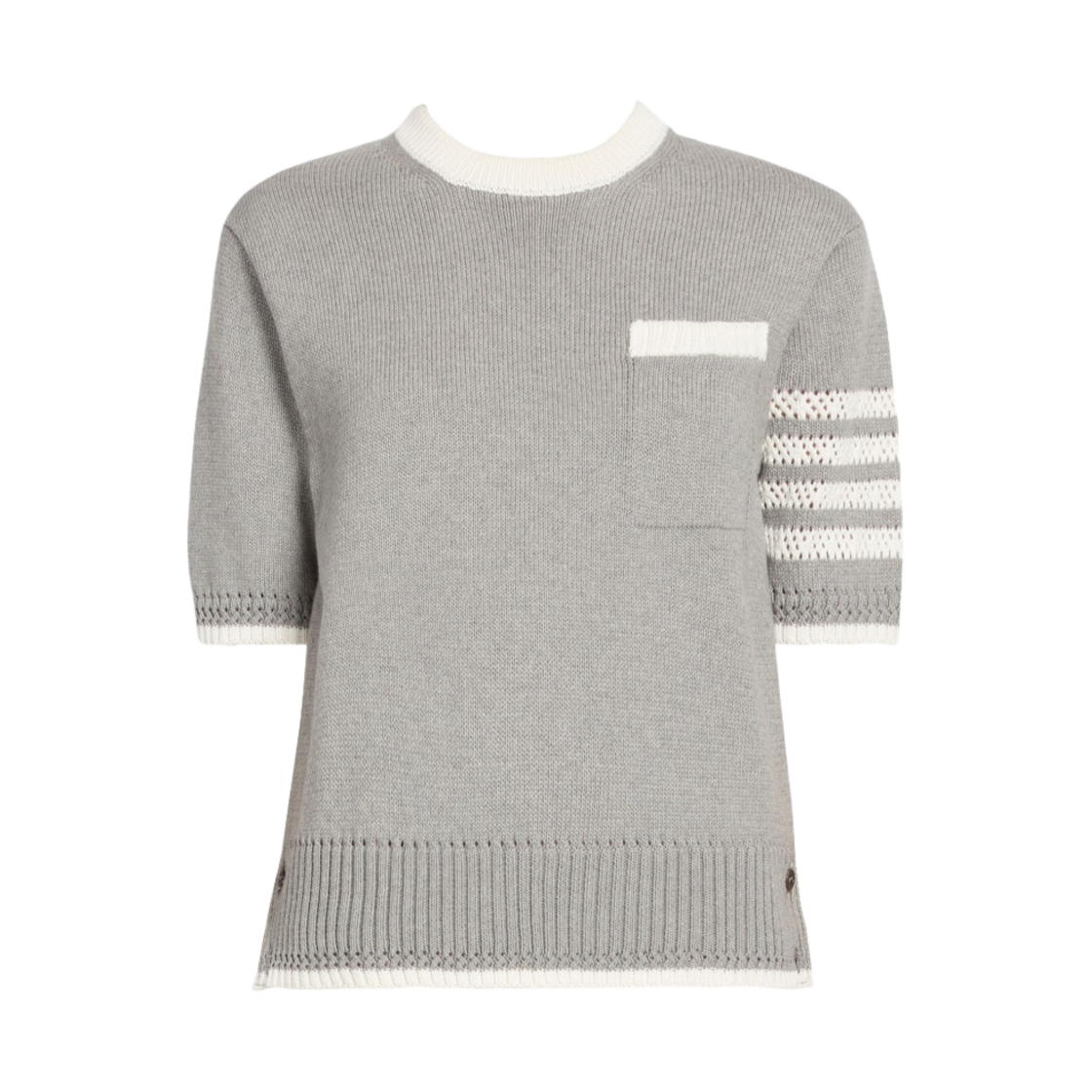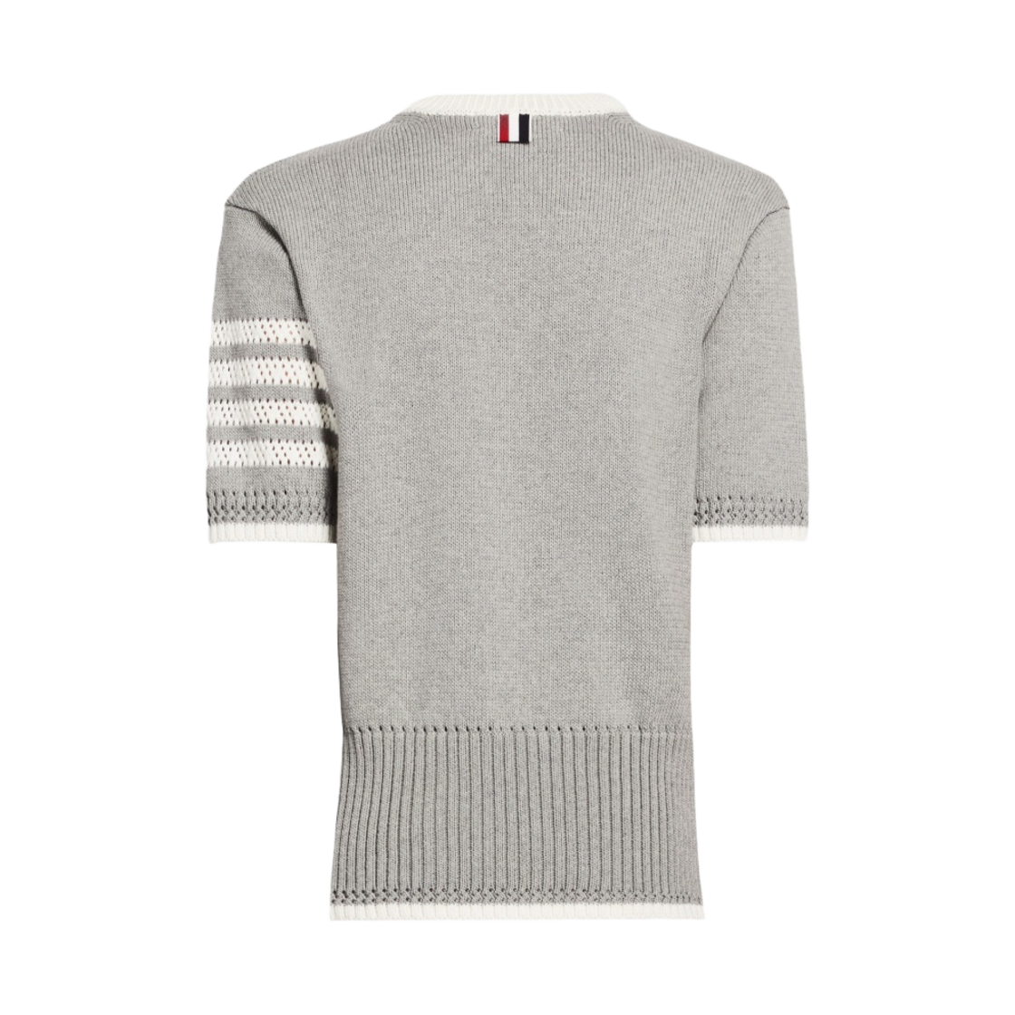 (W) Thom Browne Jersey Stitch Cotton Contrast Pointelle Tipping 4-Bar Short Sleeve Pullover Light Grey