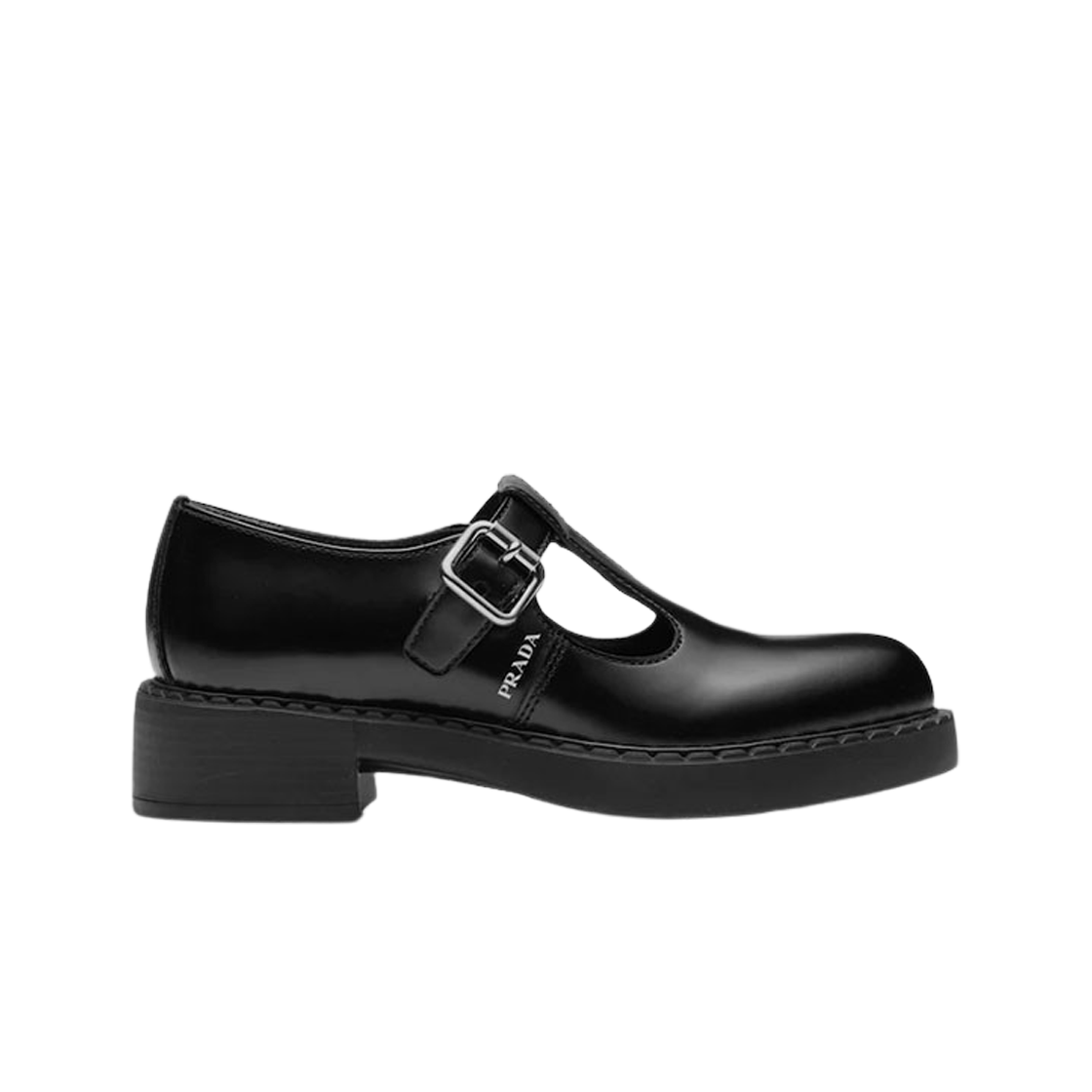 (W) 프라다 브러쉬드 레더 메리 제인 T-스트랩 슈즈 블랙