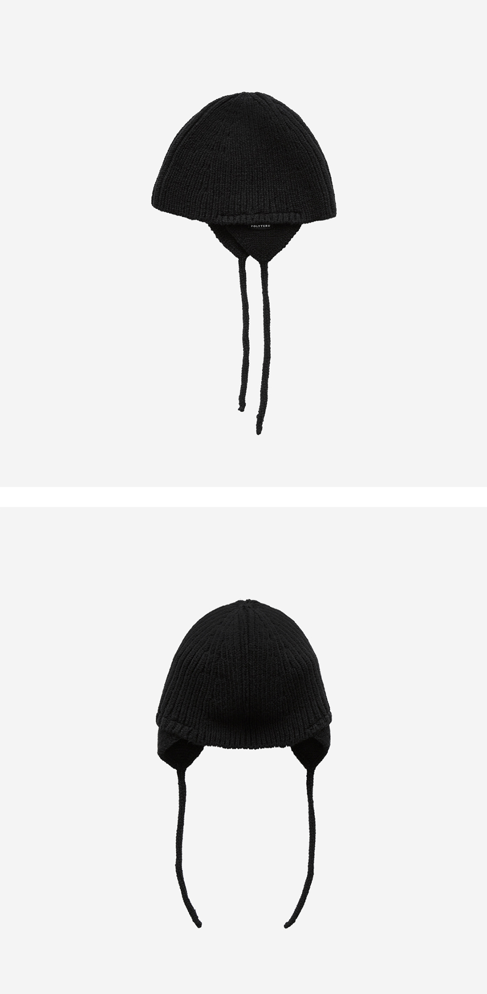 ear flap beanie - black - 부드럽고 포근한 착용감의 니트 비니 - 이어플랩 & 조임끈 - 높은 신축성 - 좌측 이어플랩 POLYTERU 로고 라벨