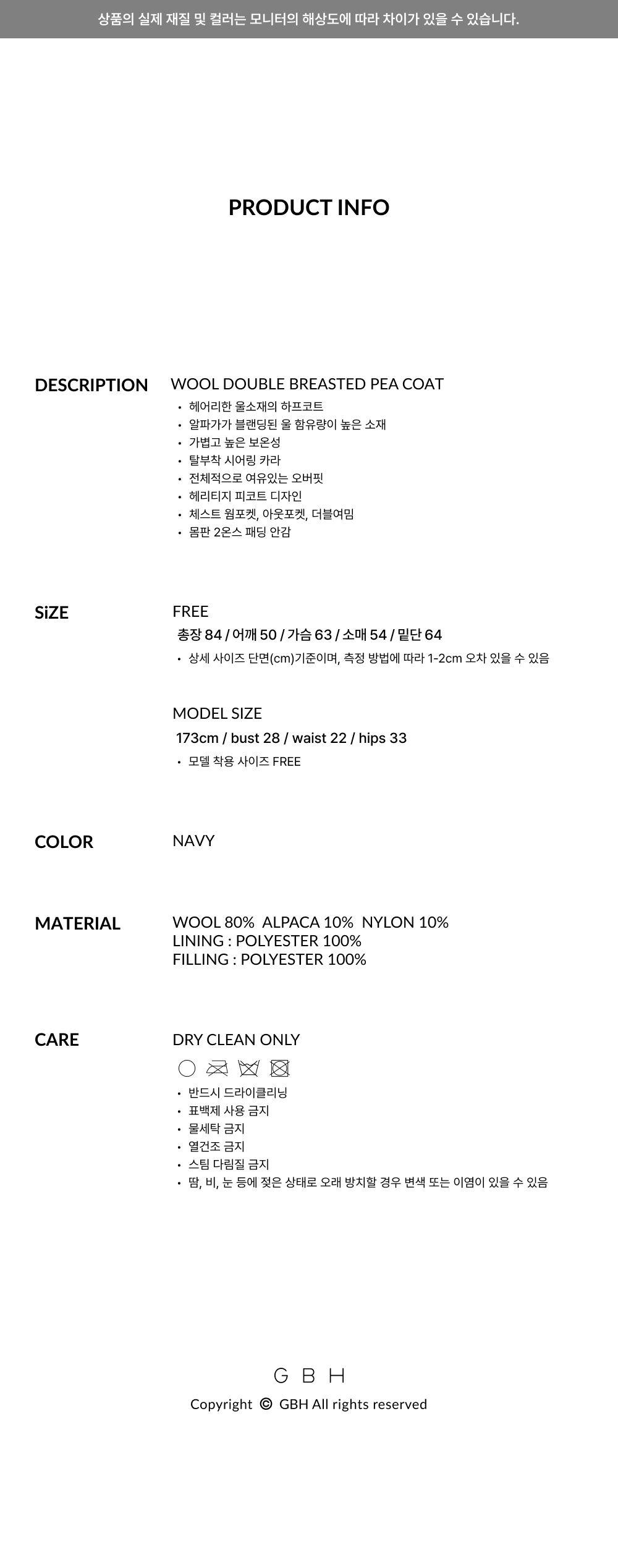 지비에이치 어페럴 울 더블 브레스티드 피 코트 / 네이비