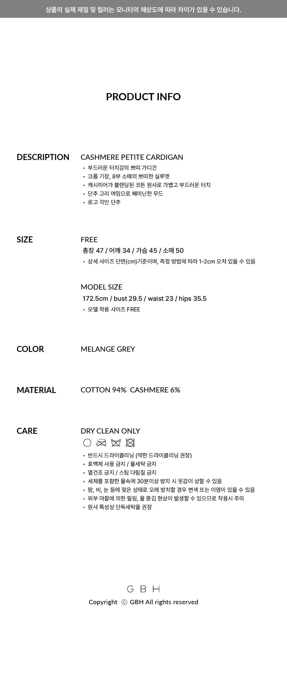 지비에이치 어페럴 캐시미어 쁘띠 카디건 / 멜란지 그레이