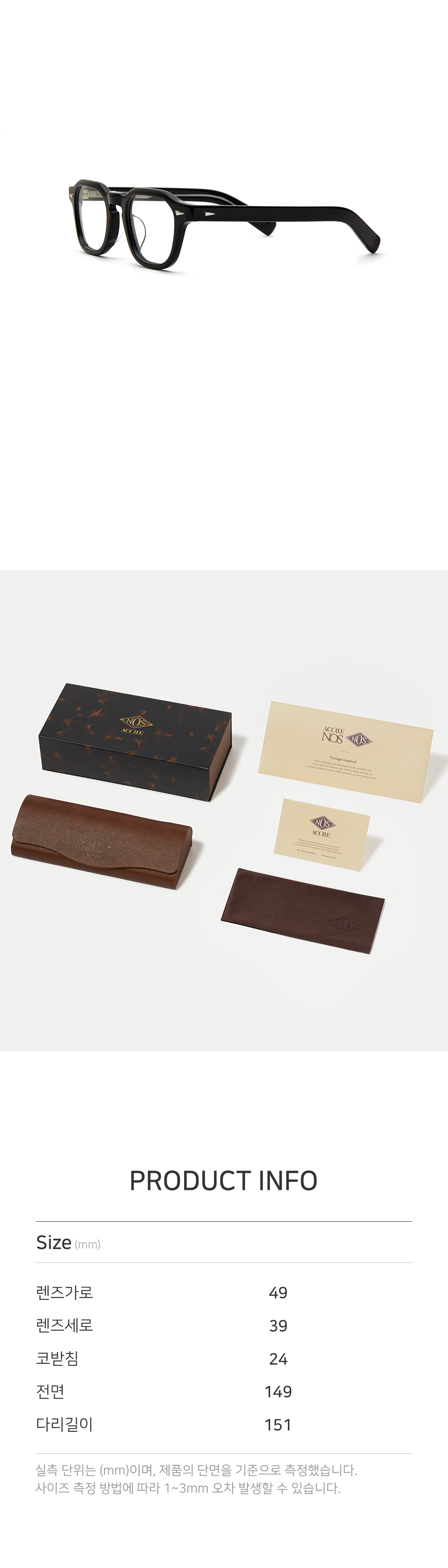 ACCRUE NOS(New old stock)는 “Vintage Inspired.” 캐치프레이즈 아래, 오랜 시간 동안 잠들어있던 과거의 오리지널리티를 그대로 재현하고, 그 속에서 새로운 가치를 창조하는 것을 목표로 합니다. NOS-15는 1950년대 프렌치 스퀘어를 모티브로 디자인되었습니다. 오리지널 빈티지에서 영감을 얻은, 프론트 상단의 각진 라인이 특징입니다. 편안하게 착용할 수 있도록 여유로운 49 사이즈와 긴 템플로 재구성되었습니다.