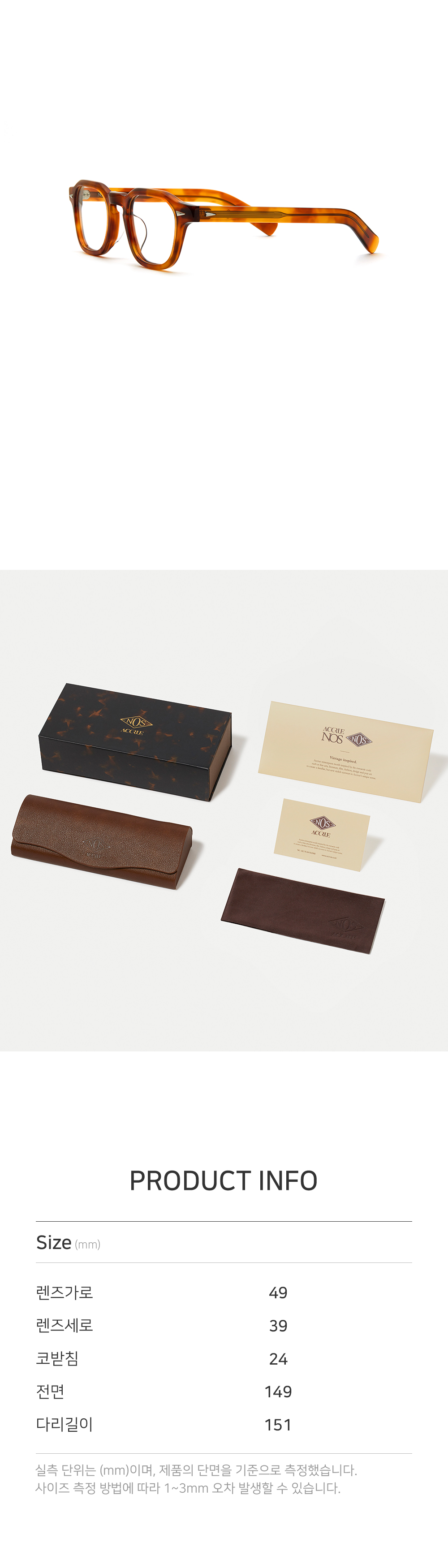 ACCRUE NOS(New old stock)는 “Vintage Inspired.” 캐치프레이즈 아래, 오랜 시간 동안 잠들어있던 과거의 오리지널리티를 그대로 재현하고, 그 속에서 새로운 가치를 창조하는 것을 목표로 합니다. NOS-15는 1950년대 프렌치 스퀘어를 모티브로 디자인되었습니다. 오리지널 빈티지에서 영감을 얻은, 프론트 상단의 각진 라인이 특징입니다. 편안하게 착용할 수 있도록 여유로운 49 사이즈와 긴 템플로 재구성되었습니다.