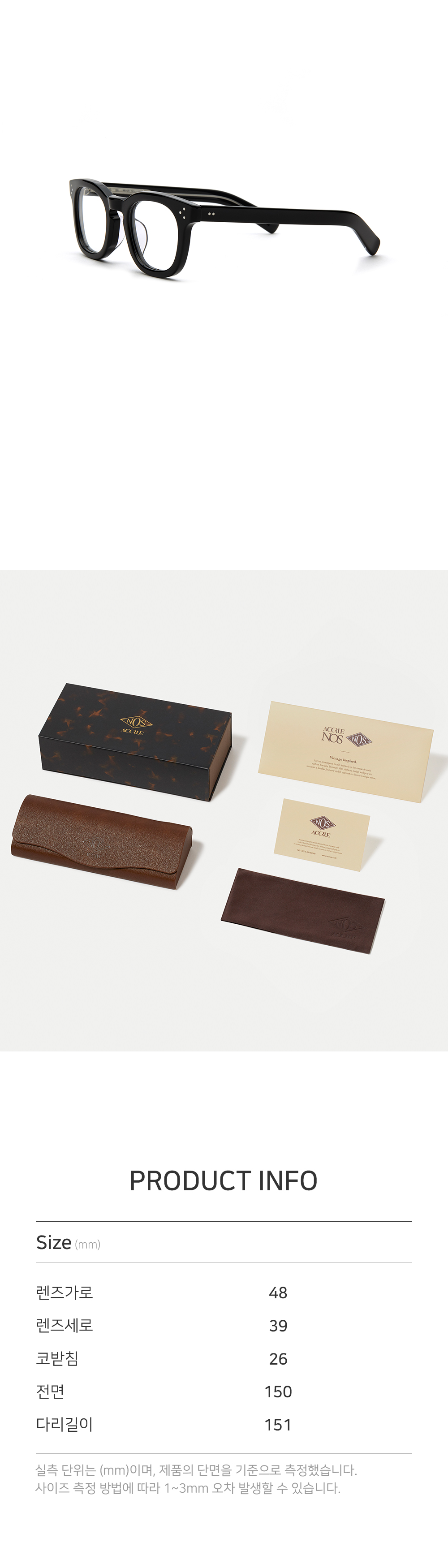 ACCRUE NOS(New old stock)는 “Vintage Inspired.” 캐치프레이즈 아래, 오랜 시간 동안 잠들어있던 과거의 오리지널리티를 그대로 재현하고, 그 속에서 새로운 가치를 창조하는 것을 목표로 합니다. NOS-16 모델은 볼드한 프렌치 웰링턴 프레임을 모티브로 디자인되었습니다. 두꺼운 프론트와 굵고 길게 뻗은 템플 조합이 강한 존재감을 더합니다. 작은 사이즈만 존재하던 쉐입을 여유로운 48사이즈로 새롭게 재구성했습니다