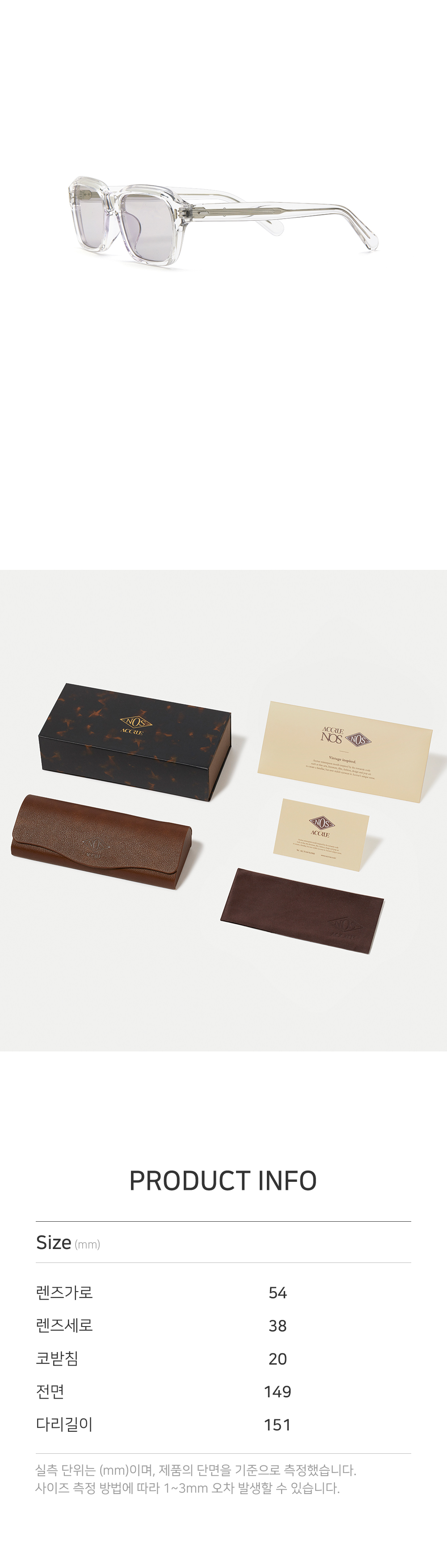 ACCRUE NOS(New old stock)는 “Vintage Inspired.” 캐치프레이즈 아래, 오랜 시간 동안 잠들어있던 과거의 오리지널리티를 그대로 재현하고, 그 속에서 새로운 가치를 창조하는 것을 목표로 합니다. NOS-17 모델은 볼드한 프렌치 웰링턴 프레임을 모티브로 디자인되었습니다. 전면부 상단의 모서리를 과감히 깎아 유려한 라인으로 다듬은 것이 특징입니다. 연한 틴트 컬러렌즈가 적용되어 클래식한 무드에 트렌디함을 조화롭게 담아냈습니다.