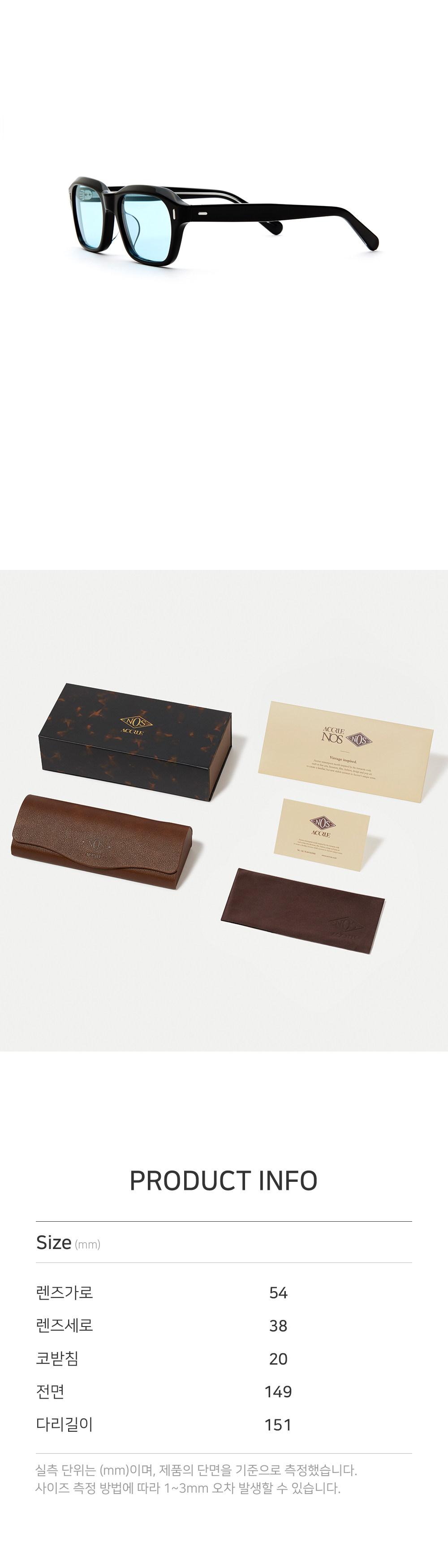 ACCRUE NOS(New old stock)는 “Vintage Inspired.” 캐치프레이즈 아래, 오랜 시간 동안 잠들어있던 과거의 오리지널리티를 그대로 재현하고, 그 속에서 새로운 가치를 창조하는 것을 목표로 합니다. NOS-17 모델은 볼드한 프렌치 웰링턴 프레임을 모티브로 디자인되었습니다. 전면부 상단의 모서리를 과감히 깎아 유려한 라인으로 다듬은 것이 특징입니다. 연한 틴트 컬러렌즈가 적용되어 클래식한 무드에 트렌디함을 조화롭게 담아냈습니다.