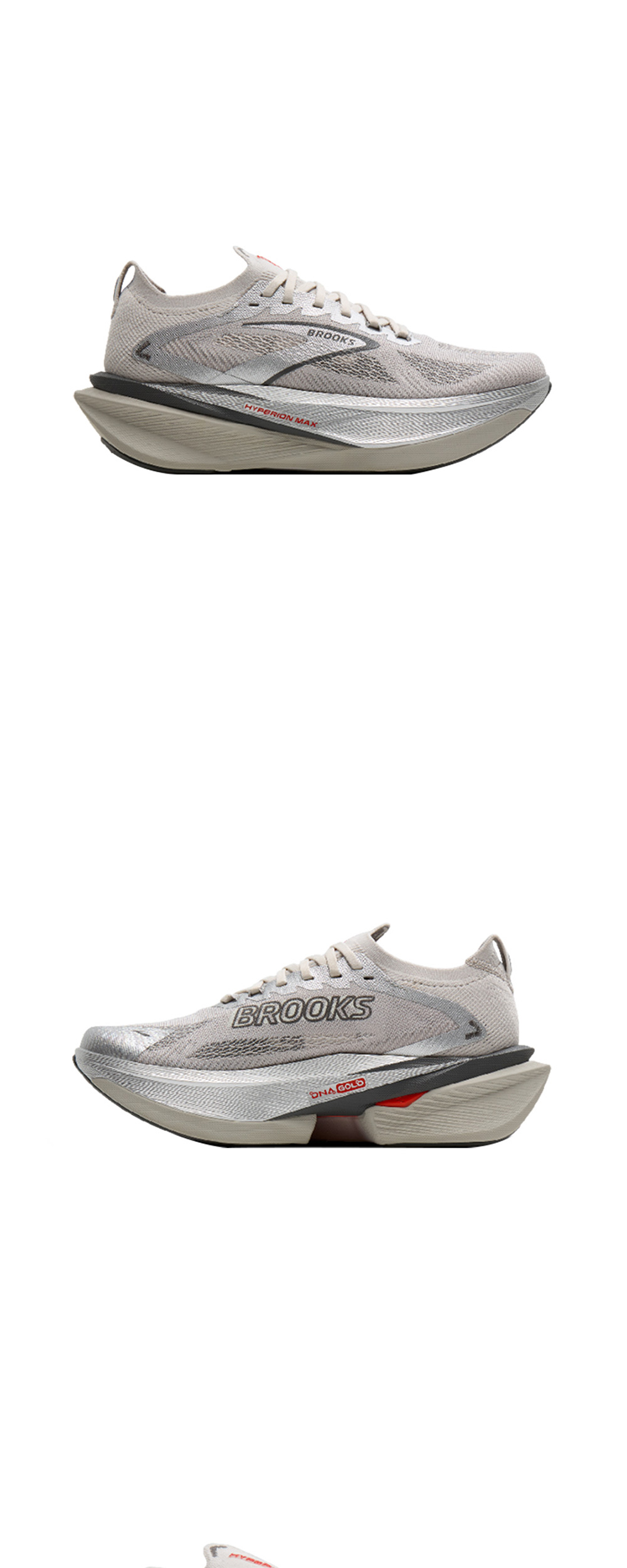브룩스 러닝 하이페리온 맥스 3 실버입니다. - 미드솔 상단에는 부드러운 쿠셔닝과 에너지 리턴을 주는 DNA GOLD - 미드솔 하단에는 가벼운을 제공하는 질소 주입의 DNA FLASH V2 - 하단 미드솔 중심부의 컷팅 디자인으로 무게를 줄이고 접촉 면적을 줄여 에너지 효율을 높임 - 효율적이고 폭발적인 러닝을 지원하는 PEBA 소재 - 가볍고 열감 배출에 최적인 니트 소재의 어퍼