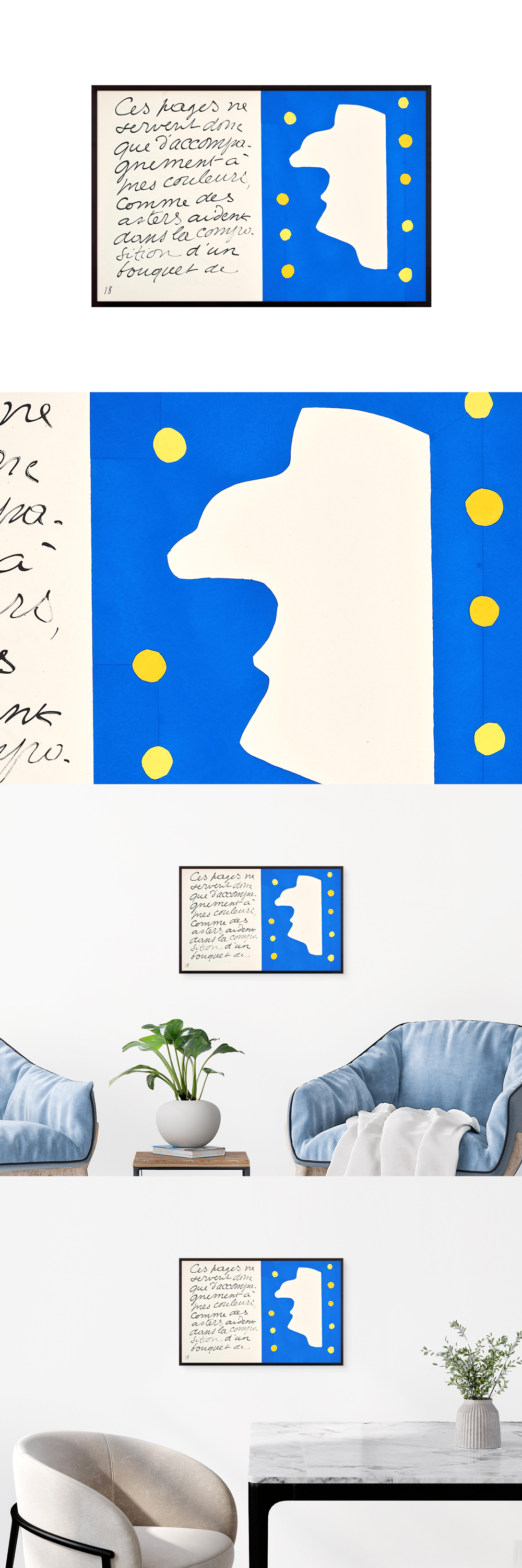 앙리 마티스(Henri Matisse, 1869–1954) 앙리 마티스는 프랑스의 대표적인 근현대 미술가로, 야수파(Fauvism)의 창시자이자 20세기 회화의 흐름을 결정지은 거장 중 한 사람입니다. 생애 대부분을 색채와 형태의 순수한 조화에 헌신했으며, 말년에는 가위로 종이를 오려 만든 컷아웃(collage) 기법으로도 큰 반향을 일으켰습니다. “나는 사람들이 그림을 보고 안락의자에 기대 앉은 것처럼 편안해지길 바란다.” 그는 예술을 통해 기쁨과 위로, 삶의 즐거움을 전달하고자 했습니다. 전쟁과 혼란의 시기를 살았지만, 그의 그림은 늘 따뜻하고 평화로운 분위기를 유지하며, 보는 이에게 긍정적인 감정을 불러일으킵니다. 크기 Image 60 x 40 cm / Frame 61 x 41cm 제작방식 Pigment print on paper 소재 Aluminium frame, Acrylic 에디션 Open Edition