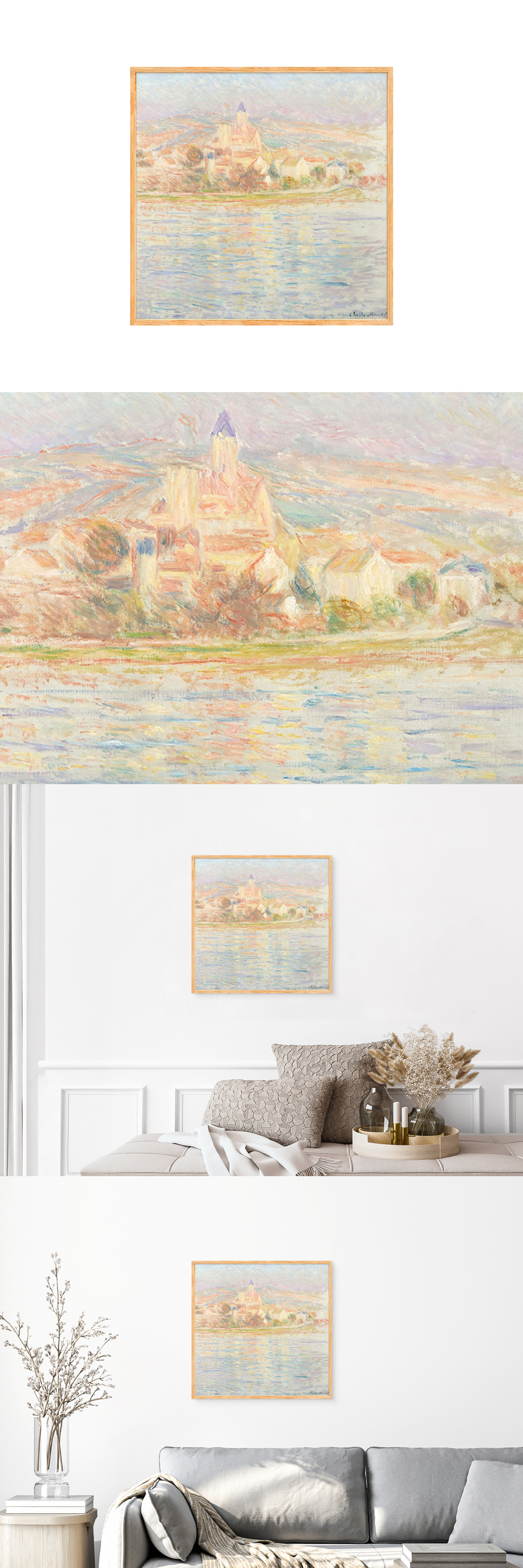 클로드 모네 (Claude Monet, 1840–1926) 클로드 모네는 프랑스의 대표적인 화가이자 인상주의(印象主義, Impressionism)의 창시자 중 한 명입니다. 자연의 순간적인 빛과 분위기를 포착하려는 시도로 회화의 새로운 길을 연 그는, “빛의 화가”로 불리며 오늘날까지도 가장 사랑 받는 화가 중 한 명입니다. 베퇴유(Vétheuil)는 파리에서 북서쪽으로 약 60km 떨어진 세느강 인근의 작은 마을로, 모네는 1878년부터 1881년까지 실제로 이곳에서 거주한 바 있습니다. 이 시기 이후에도 그는 이 마을을 여러 번 방문하며 수많은 작품의 소재로 삼았습니다. 이 작품은 모네가 말년에 다시 베퇴유를 방문해, 세느강 너머에서 바라본 마을 전경을 그린 것으로 추정됩니다. 크기 Image 42 x 42 cm / Frame 43 x 43cm 제작방식 Pigment print on paper 소재 Aluminium frame, Acrylic 에디션 Open Edition