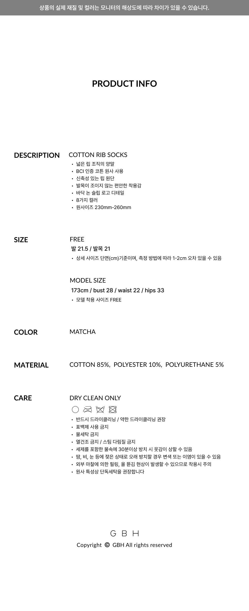 지비에이치 어페럴 코튼 립 삭스 / 말차