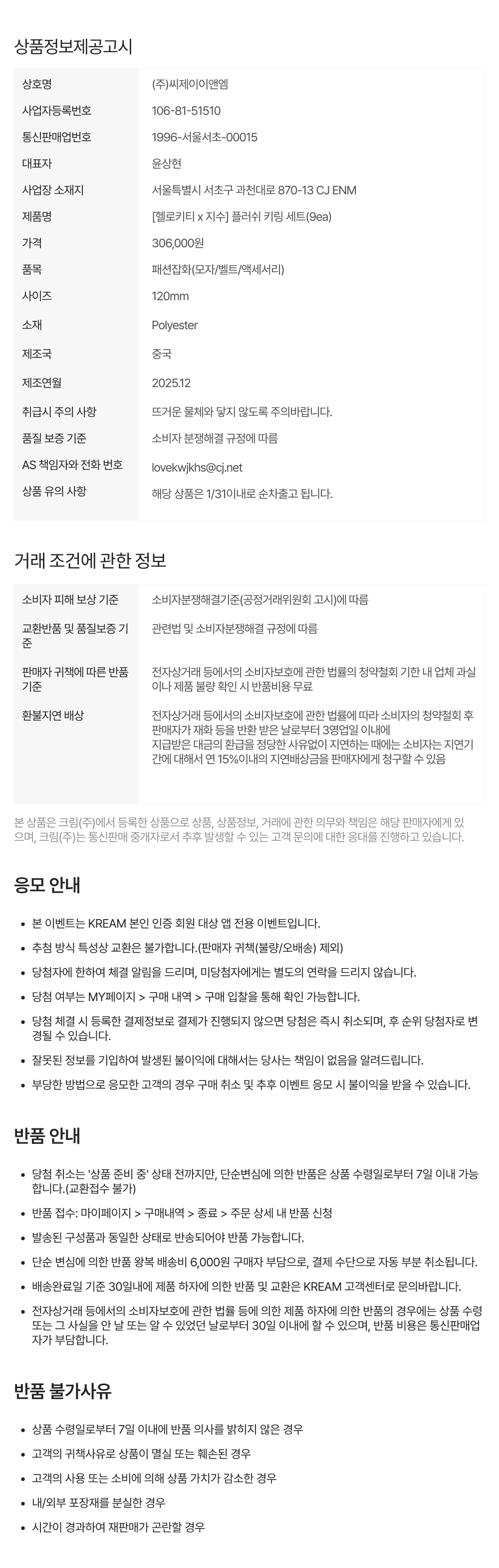 추첨 방식 특성상 교환은 불가합니다.(판매자귀책(불량/오배송)제외)
