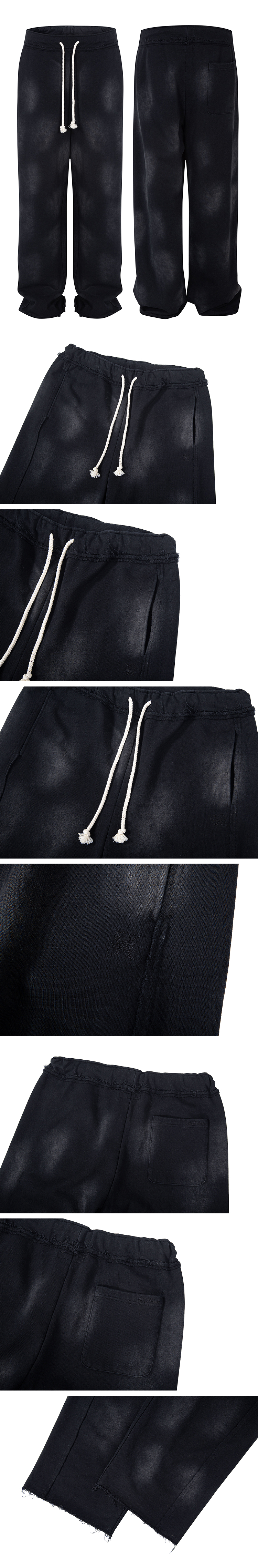 스프레이 워싱 처리된 스웻팬츠로, raw-edge 마감 디테일과 로프 드로우스트링이 적용되었습니다. 전면에는 심볼 자수, 후면에는 로고 자수가 더해져 포인트를 주었습니다. 워싱 공정 특성상 개체별 톤 차이와 원단 표면의 불규칙한 약품 처리는 불량이 아닌 의도된 빈티지 가공으로, 자연스러운 질감과 색감을 표현한 것입니다. 세탁 시 이염 가능성이 있으니 반드시 단독 세탁해 주시기 바랍니다.