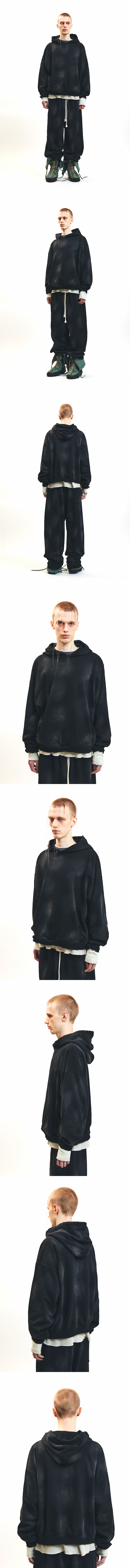 스프레이 워싱 처리된 후드로, 구제 데미지 디테일과 사이드 히든포켓이 적용되었습니다. 후드 안감은 와플 조직으로 완성되어 착용 시 텍스처 대비감을 주며, 전면 심볼 자수와 후면 로고 자수로 포인트를 더했습니다. 워싱 공정 특성상 개체별 톤 차이와 원단 표면의 불규칙한 약품 처리는 불량이 아닌 의도된 빈티지 가공으로, 자연스러운 질감과 색감을 표현한 것입니다. 세탁 시 이염 가능성이 있으니 반드시 단독 세탁해 주시기 바랍니다.