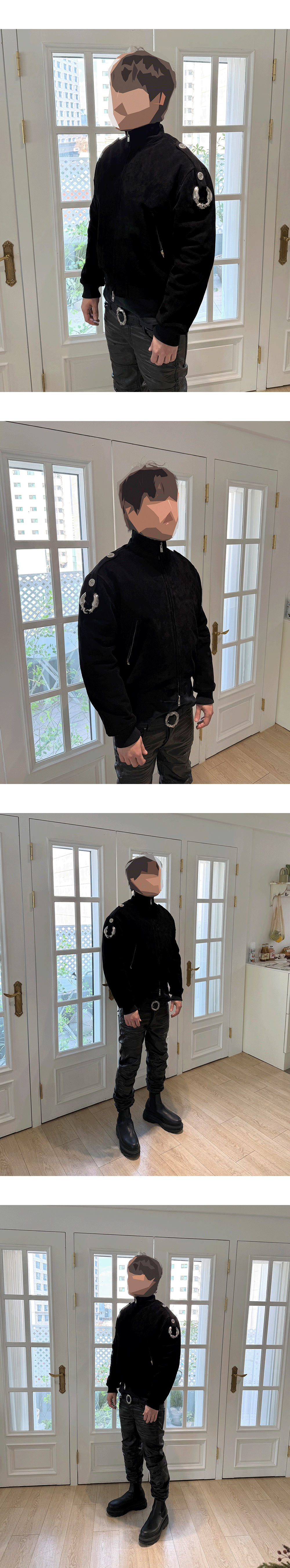 맞잡은 손을 표현한 두 개의 링을 견장에 연결한 스웨이드 블루종 Model spec – 178cm / 70kg - Size 1 착용