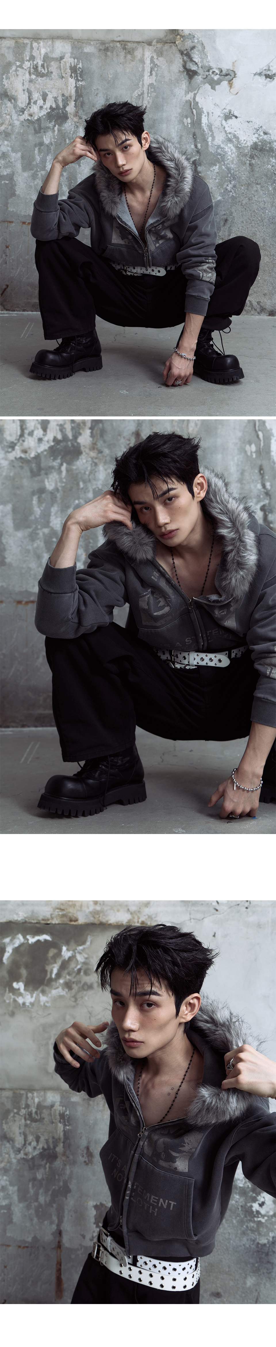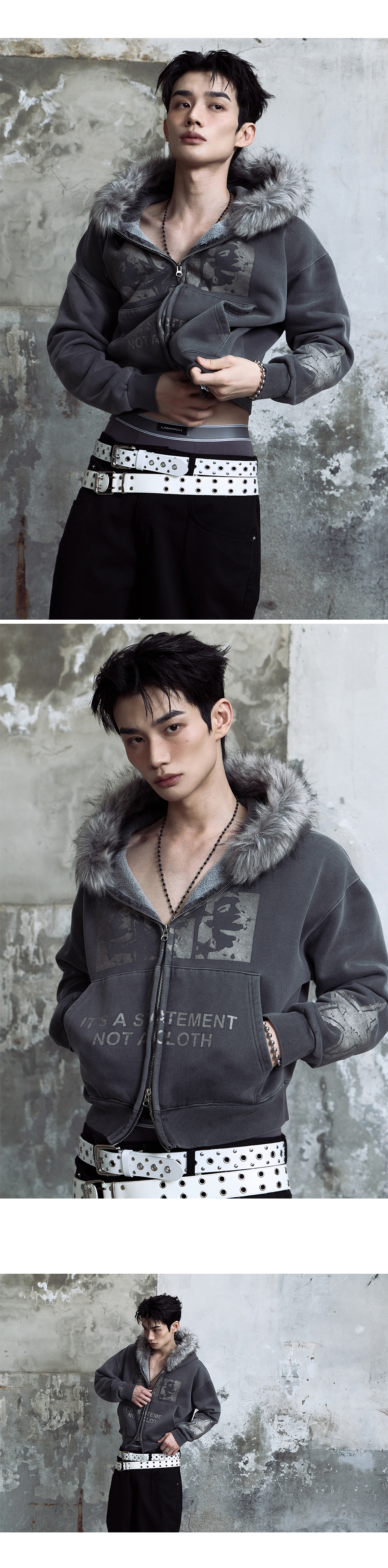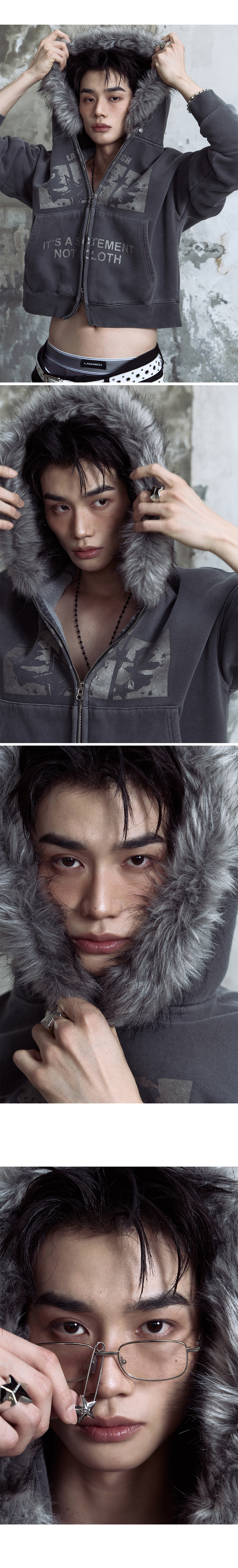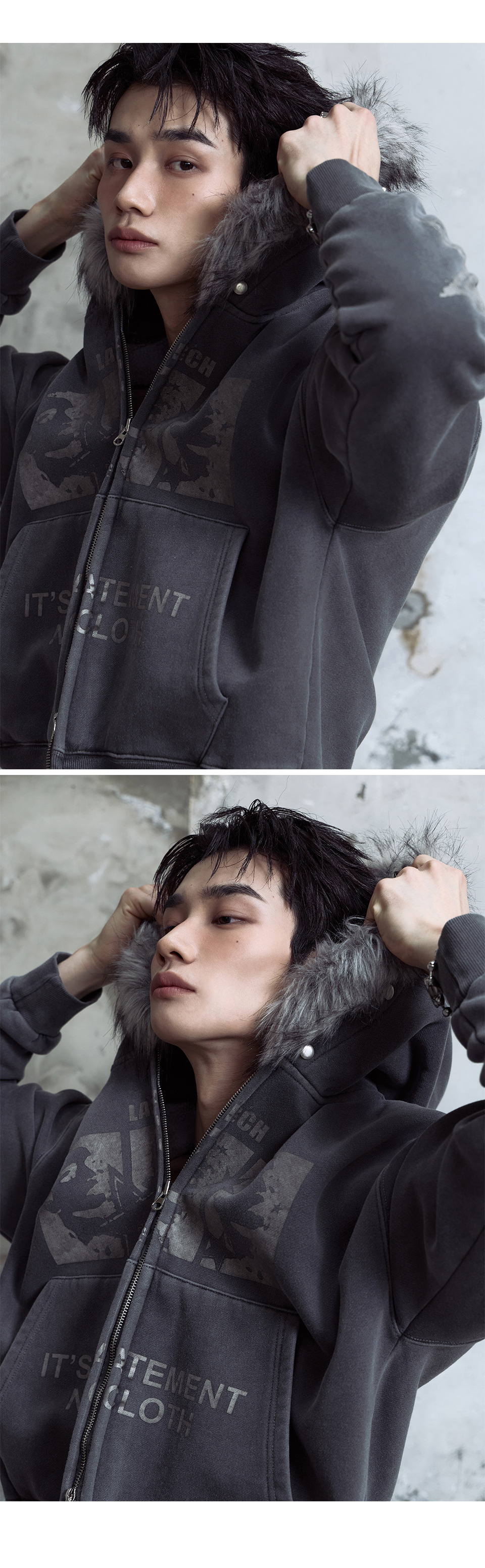 LAN ARCHIVE 0088 Fox Fur Star Print Hoodie Zip-up - Charcoal