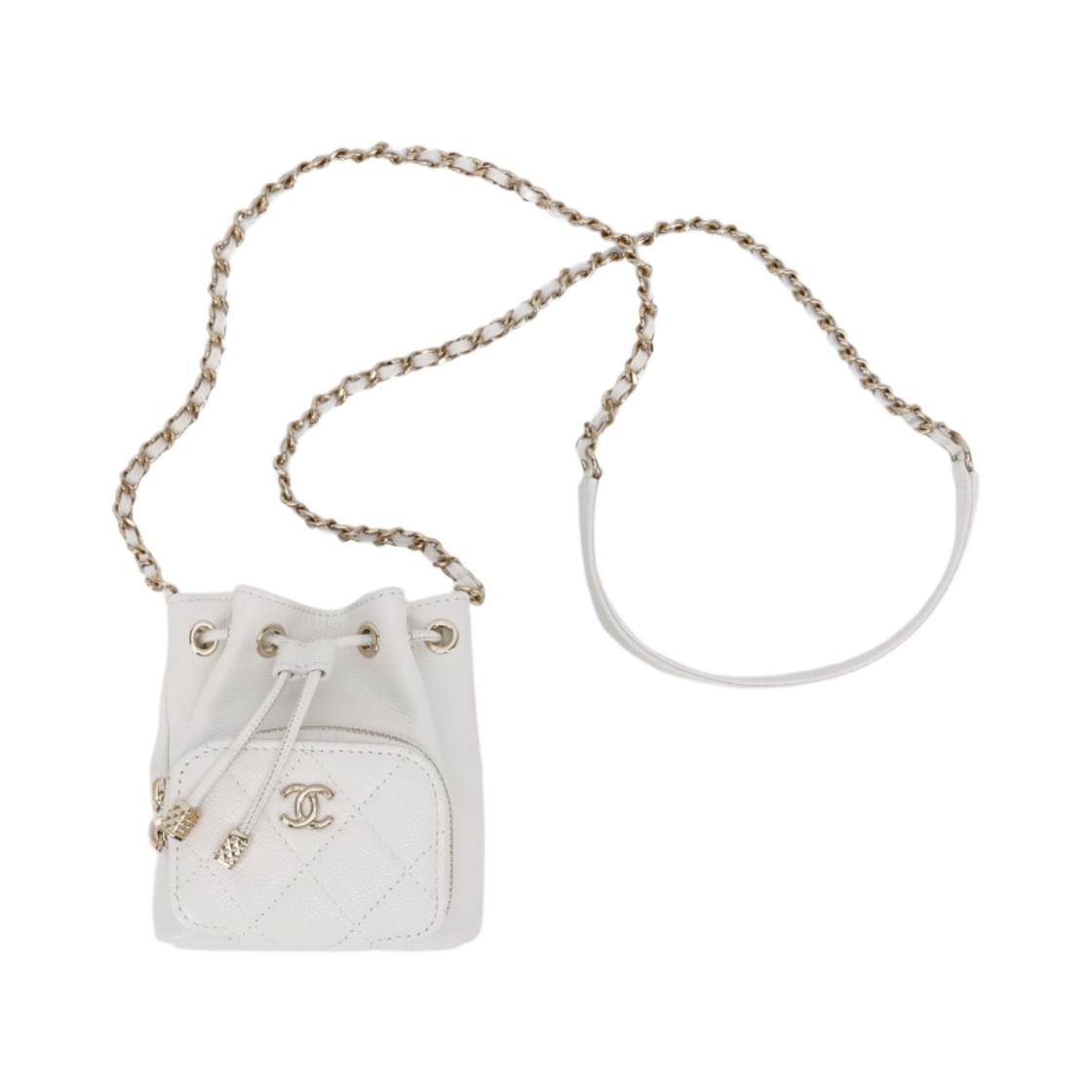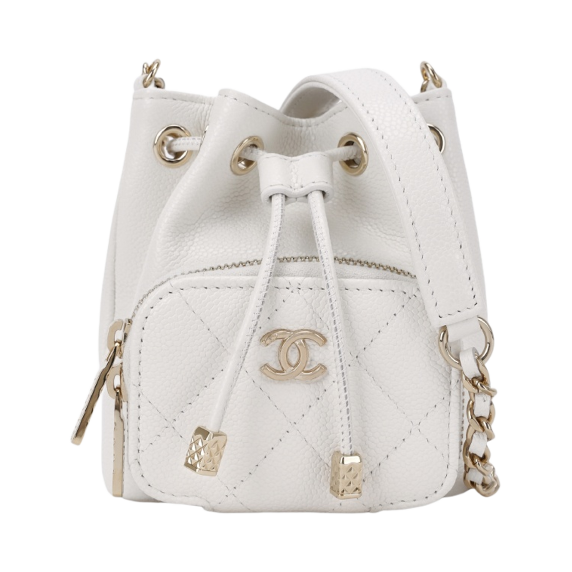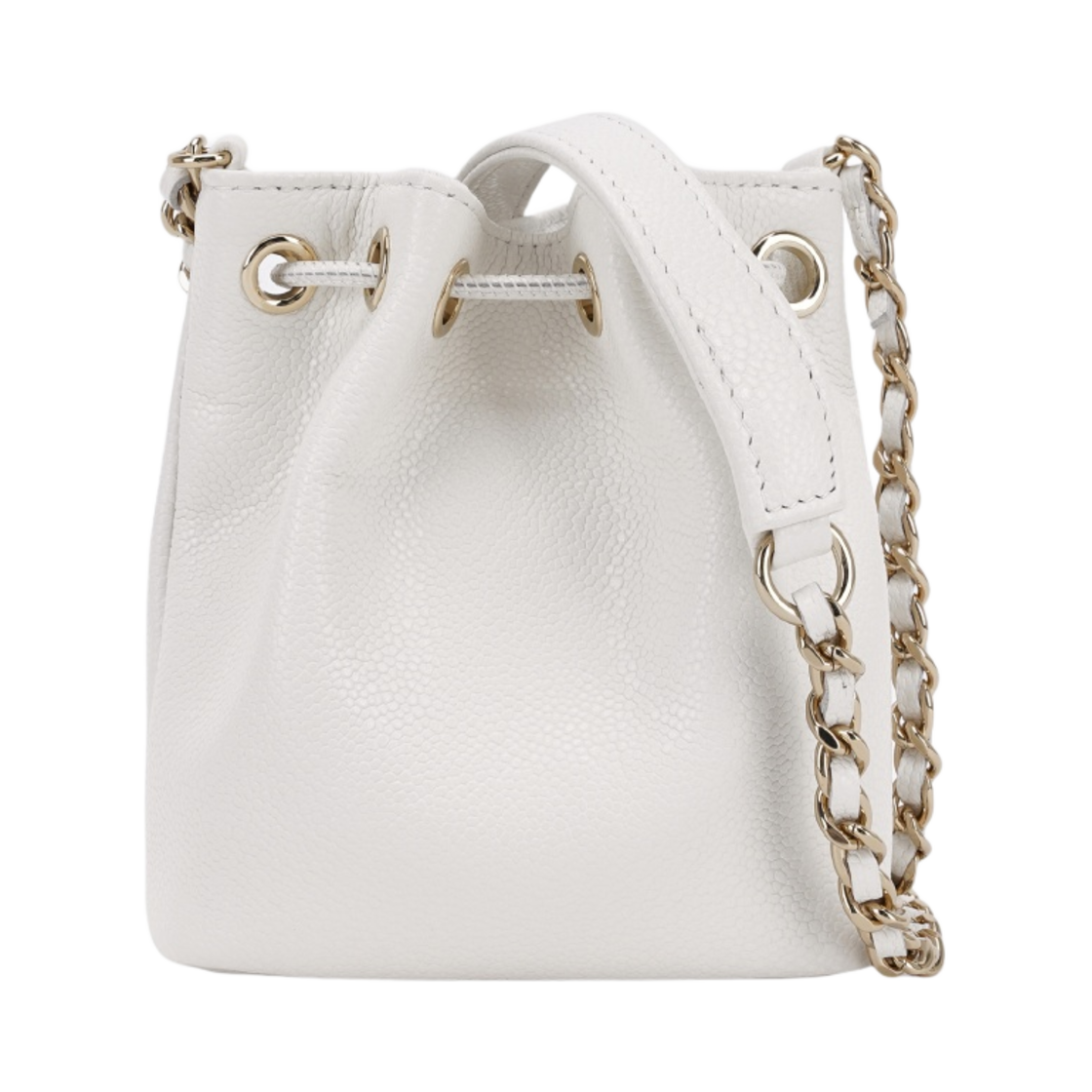 샤넬 미니 체인 버킷 그레인드 카프스킨 & 골드 메탈 화이트