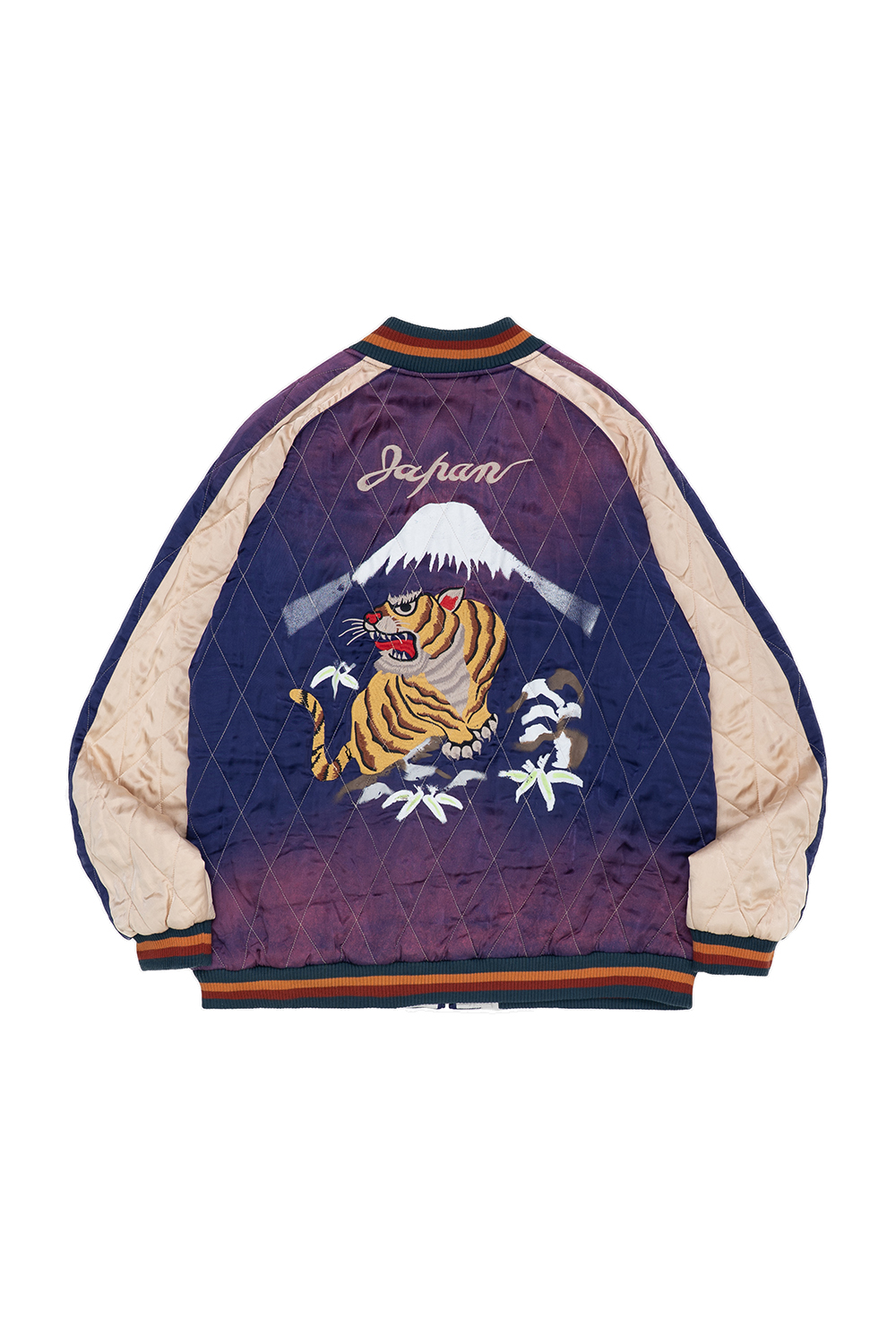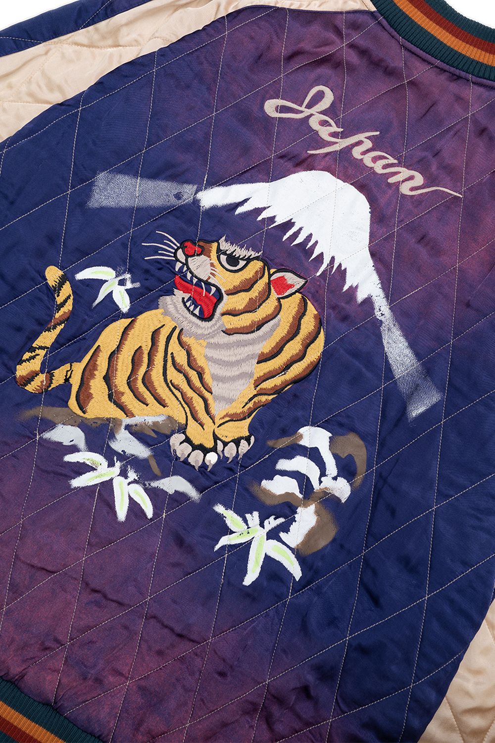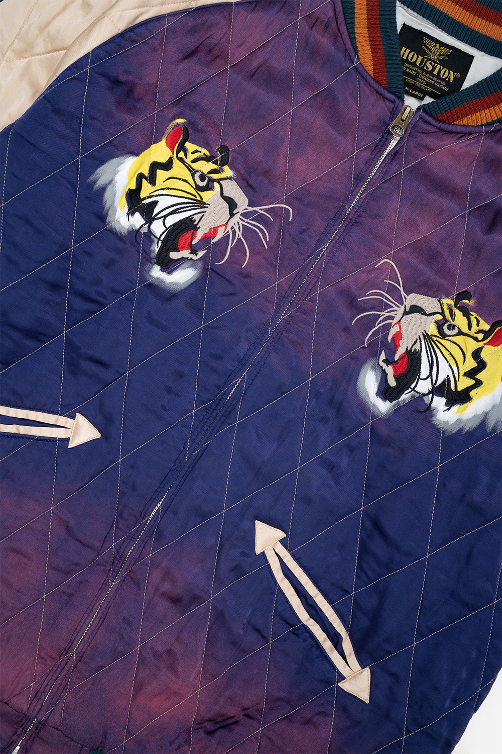 Houston Japan 51528VW Vintage Wash Souvenir Jacket (Tiger) - Navy 'HOUSTON 스카잔 시리즈' 의 인기모델 호랑이 자수+프린트로 표현한 상품입니다. 퀄팅 사양의 스카잔을 부분적으로 페이드감을 재현한 것이 특징입니다. 유연 가공과 원워시 가공으로 부드러운 촉감과 빈티지한 분위기를 더했습니다.. * Outer : Rayon 100% * Lining : Rayon 100% * Rib : Acrylic 100% * Filling : Polyester 100% * 일본 장인에 의한 가공 제품으로, 개체 차이가 존재하는 제품입니다. * 빛에 의한 제품의 색감 차이가 존재 할 수 있습니다. * Made In China