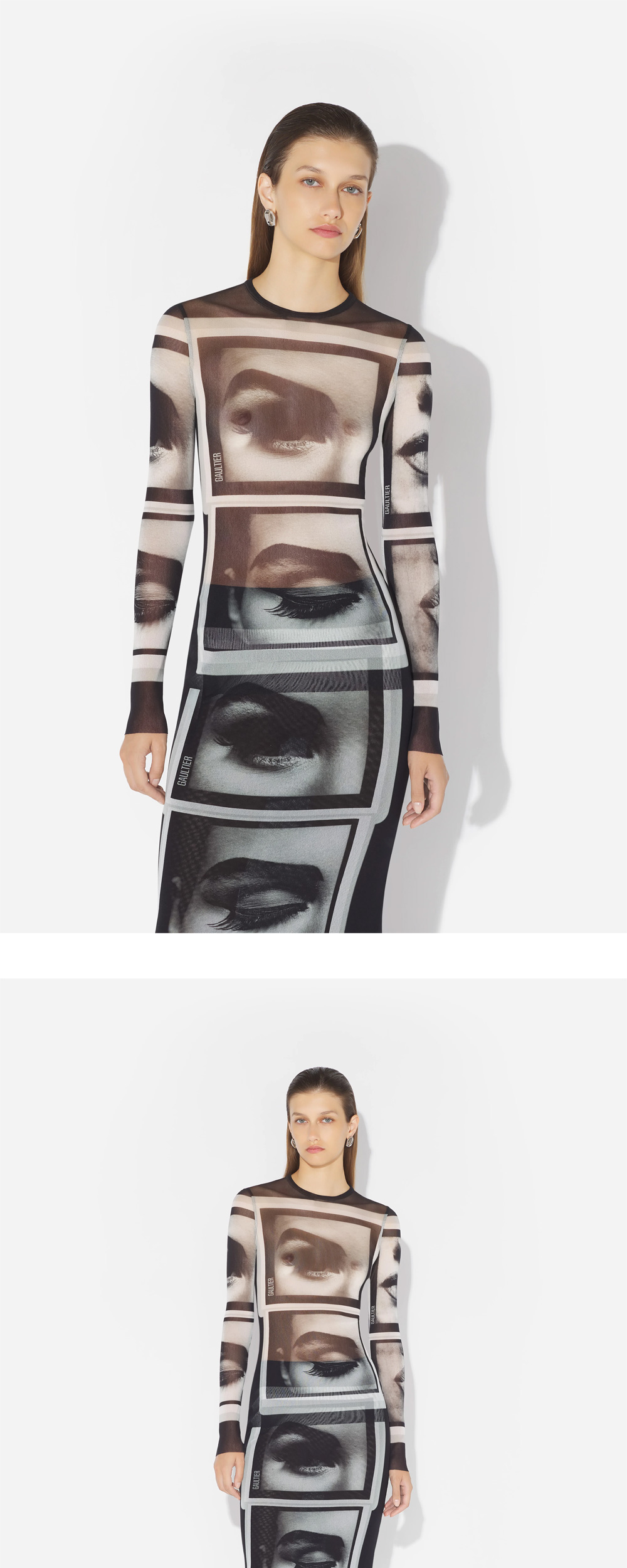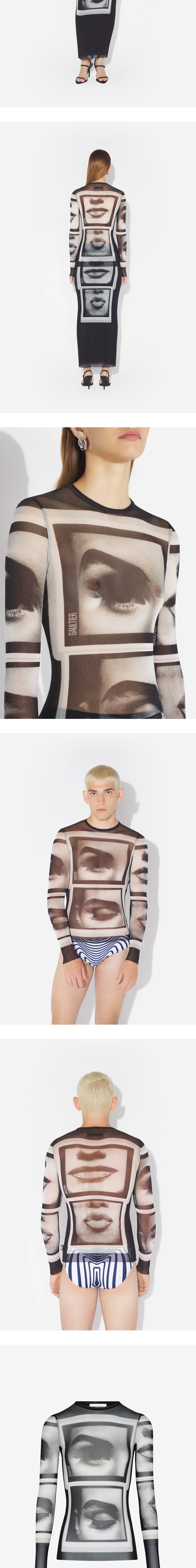 장 폴 고티에 우먼 리-에디션 : 메쉬 롱슬리브 탑 프린티드 "Eyes" 앤 "Lips" 그레이 – 26SS