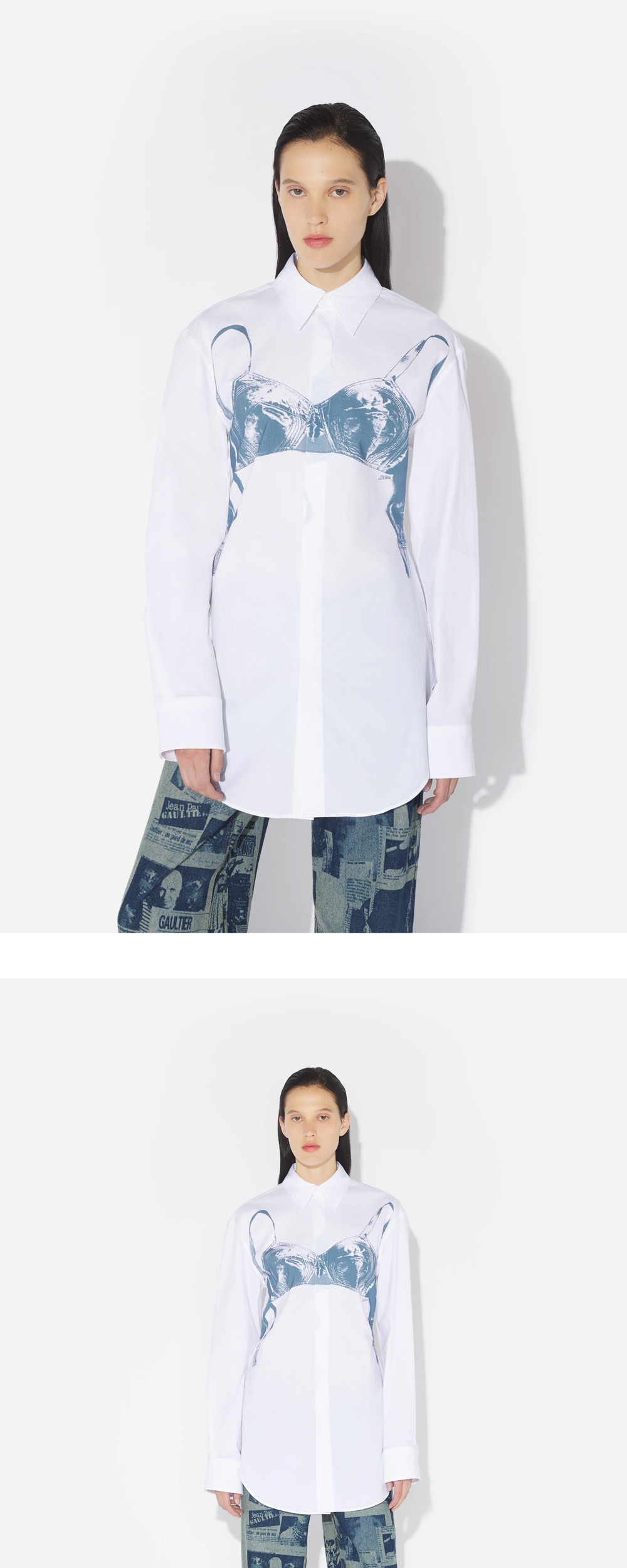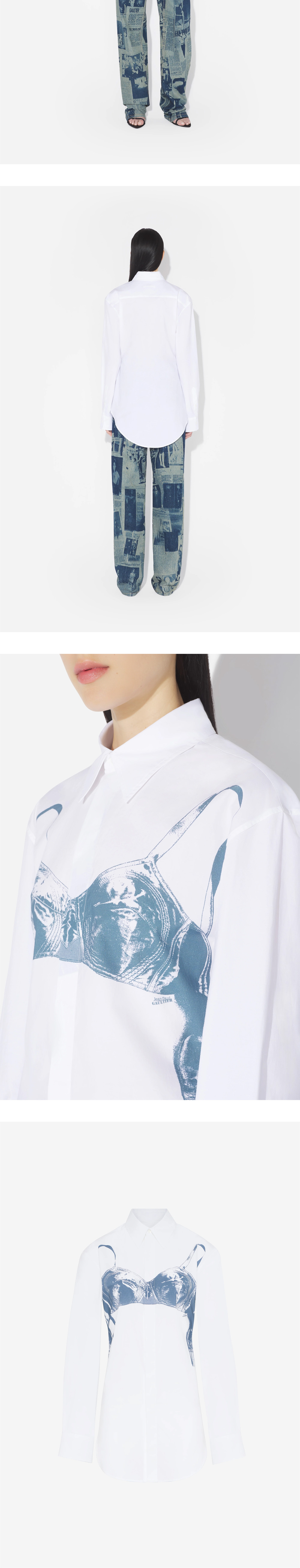장 폴 고티에 우먼 셔츠 프린티드 "Scanned Bra" 화이트입니다. - 화이트 셔츠 위에 브라가 비치는 듯한 그래픽 프린트 - 앞 여밈과 소매에 자개 단추 * 모델: 177cm, 36사이즈 착용