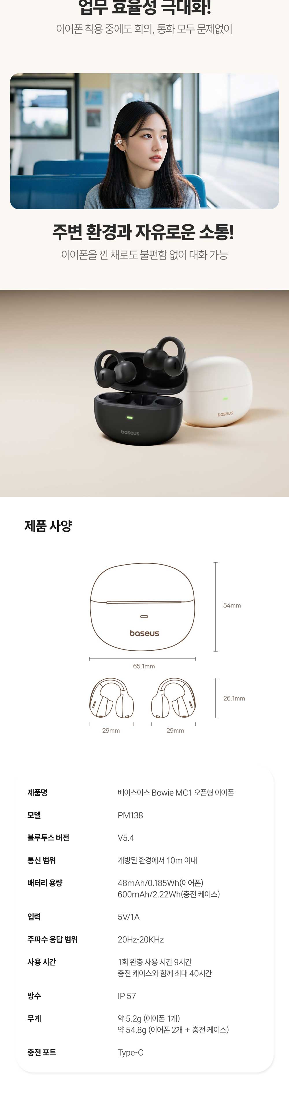 베이스어스 블루투스 이어폰 무선 오픈형 러닝 클립형 런닝 귀걸이형 MC1