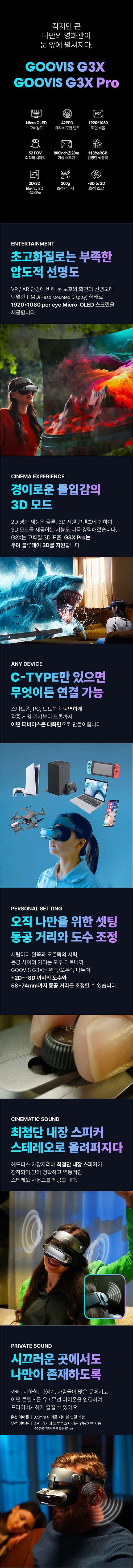 착용하는 순간, 그 곳이 어디든 시네마가 된다. GOOVIS G3X 시리즈는 쉽게 말해 '머리에 착용하는 스크린'이라고 생각하면 좋습니다. 고글 쓰듯 쉽게 착용하고, 스마트폰이나 노트북을 연결만하면 눈 앞에 화면이 펼쳐지죠.